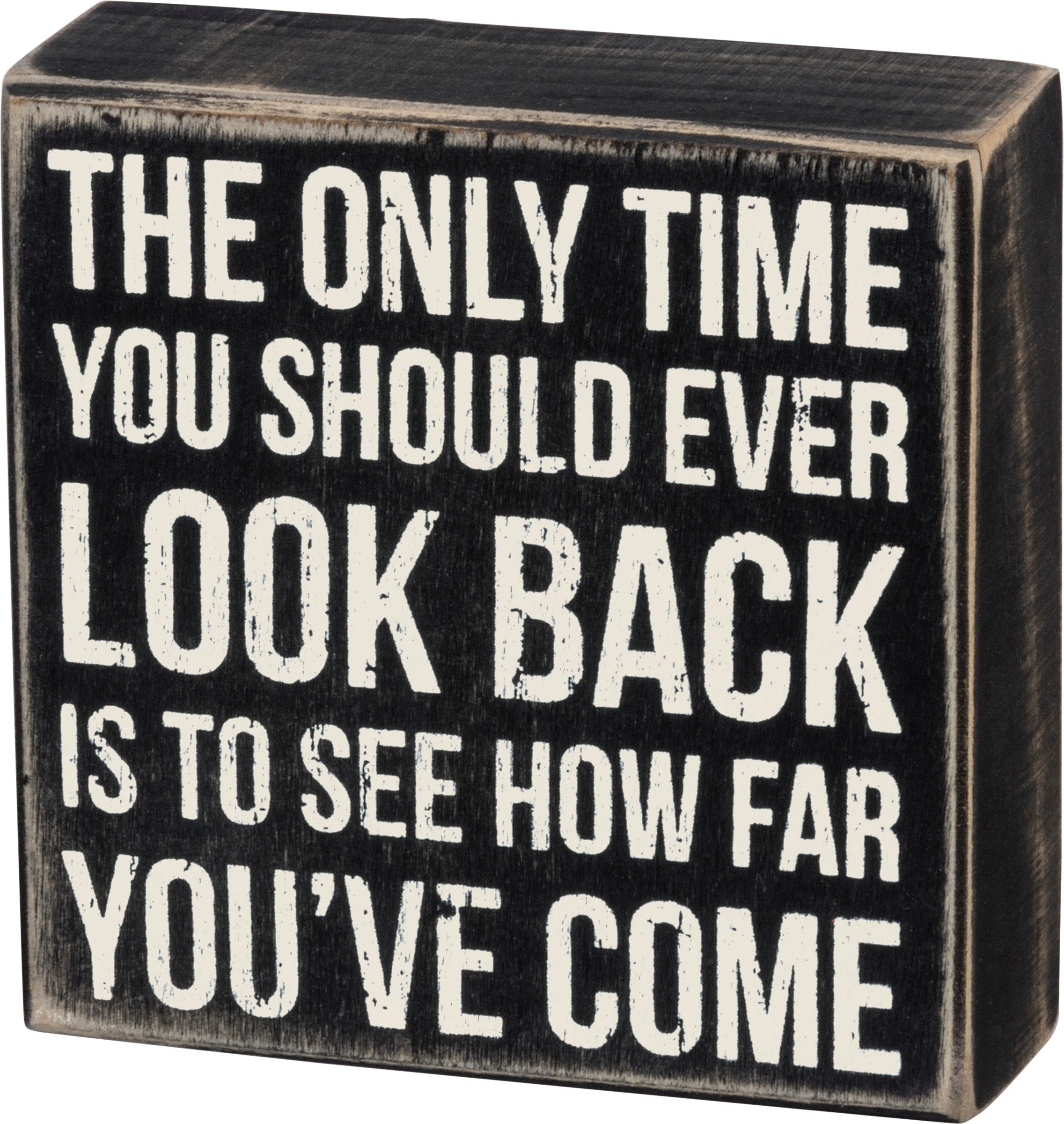 A classic black and white wooden box sign featuring a distressed "The Only Time You Should Ever Look Back Is To See How Far You've Come" sentiment. Easy to hang or can free-stand alone.