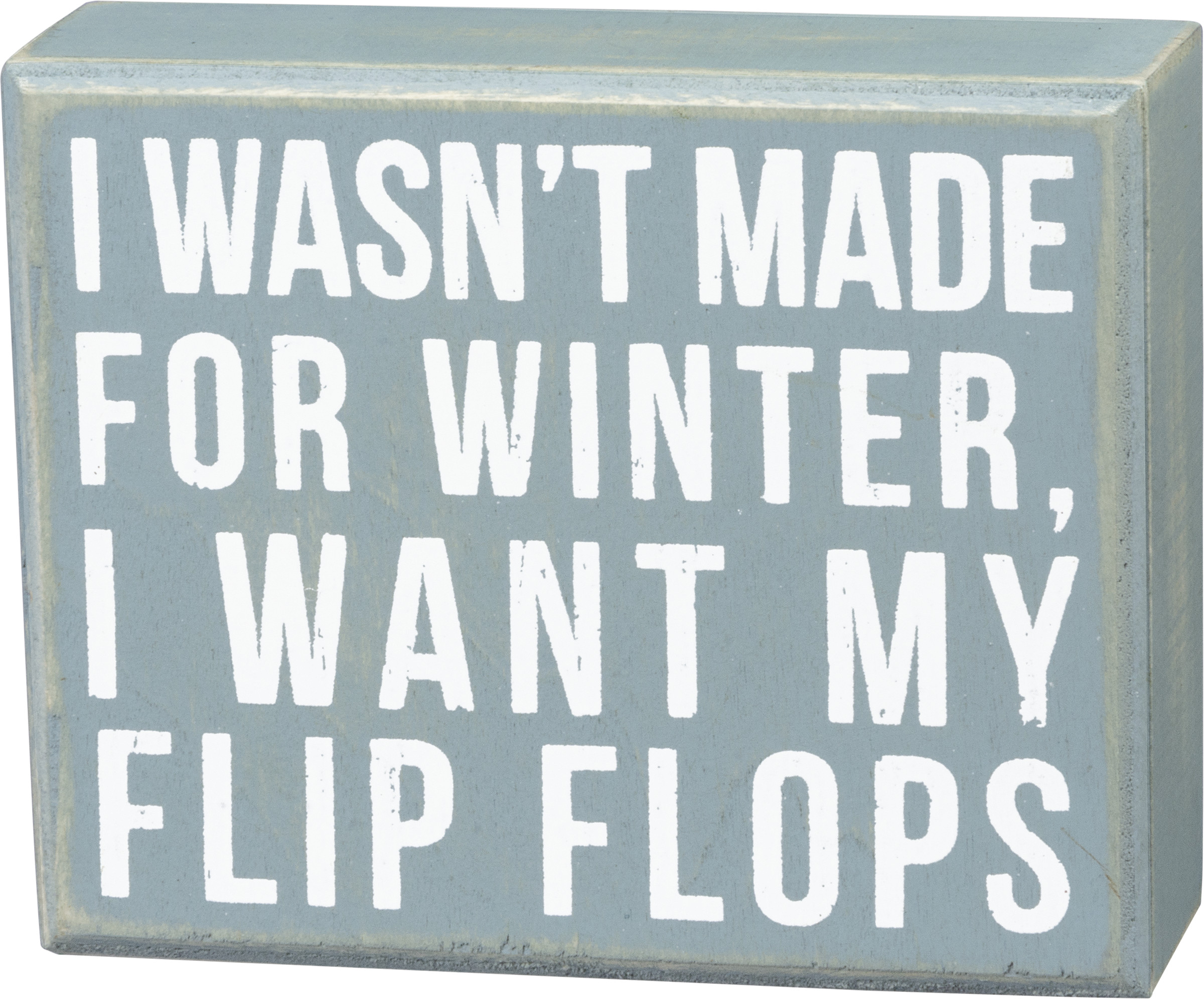 A wooden box sign featuring a distressed "I Wasn't Made For Winter, I Want My Flip Flops" sentiment in a beach-inspired palette. Complements well with existing decor or coordinating design pieces. Easy to hang or can free-stand alone on a shelf or mantel.