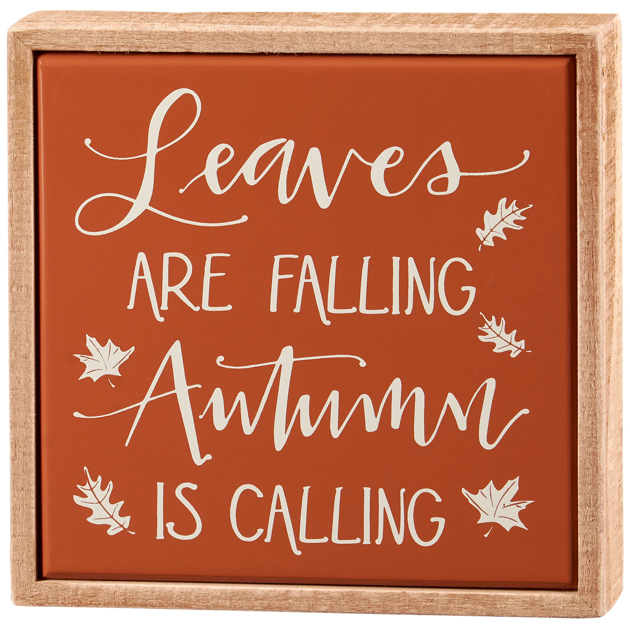 A small wooden box sign from our Fall & Harvest Collection displaying fall leaf designs and a fun seasonal sentiment in a hand illustrated style on autumn orange background that reads "Leaves Are Falling Autumn Is Calling." Fall box sign features a natural wood frame and faux enamel finish behind design for a tile-like appearance. Our Autumn Is Calling box sign mini is easy to hang or can free-stand alone. A fun fall-themed home accent that can easily blend into any display.