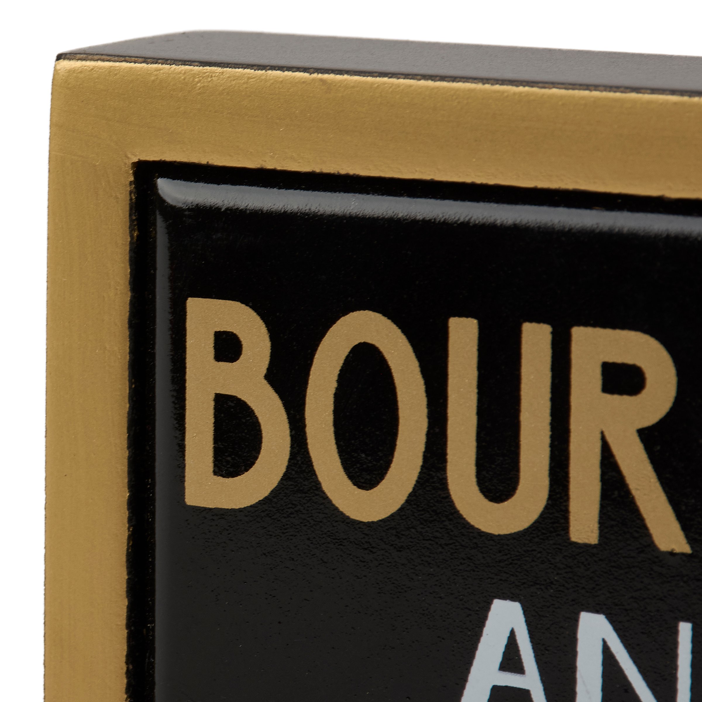 A small wooden box sign from our Art Deco Collection displaying an art deco inspired design with a fun alcohol themed sentiment that reads "Bourbon And Bullshit Area." Mini bar sign features a black and metallic gold color palette with a faux enamel finish behind design for a tile-like appearance. Our Bourbon Area sign is easy to hang or can free-stand on a flat surface for display. A fun alcohol themed home accent that adds style and personality to bar decor.