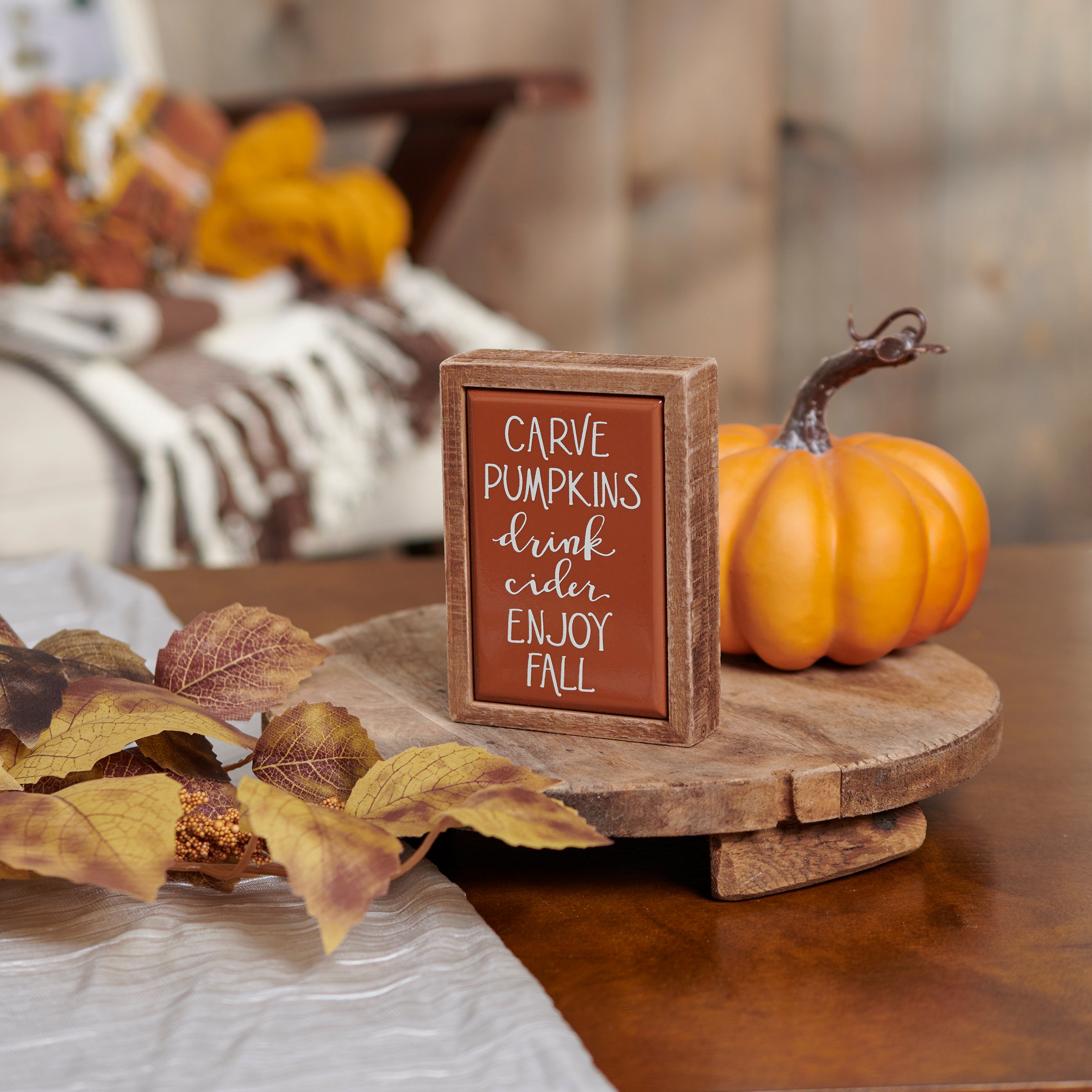 A small wooden box sign from our Fall & Harvest Collection displaying a fun fall inspired sentiment in a unique hand illustrated style that reads "Carve Pumpkins - Drink Cider - Enjoy Fall." Box sign features a natural wood frame and faux enamel finish behind design for a tile-like appearance. Our Enjoy Fall mini sign is easy to hang or can free-stand alone. A fun gift perfect as a seasonal home accent that can easily blend into any display.