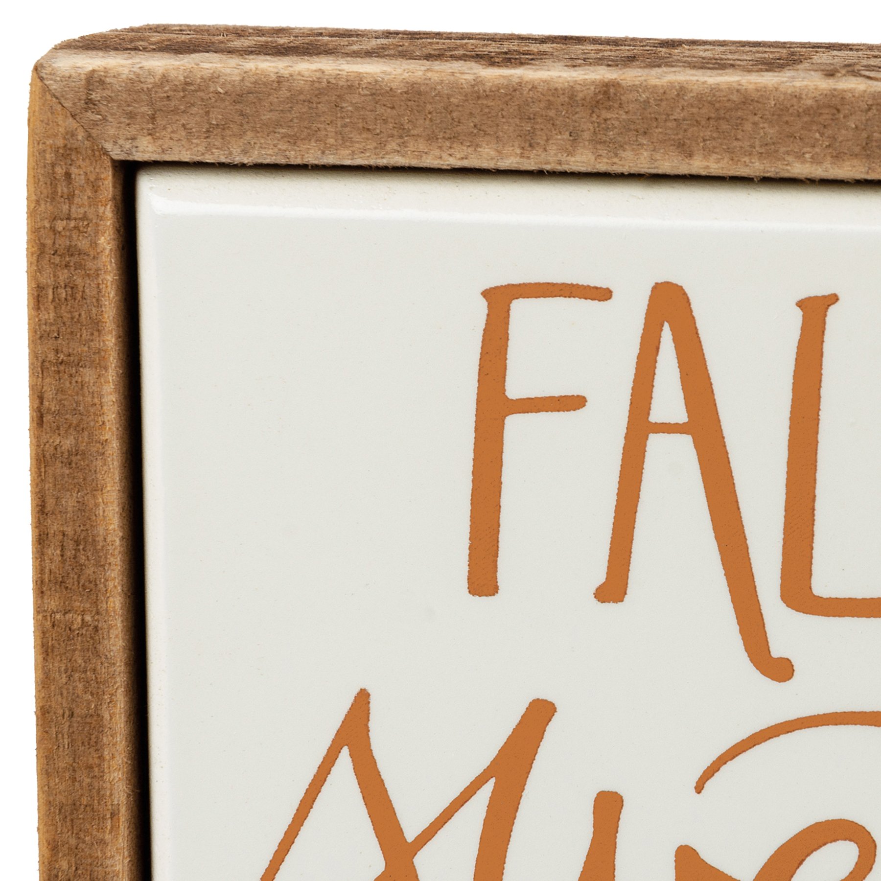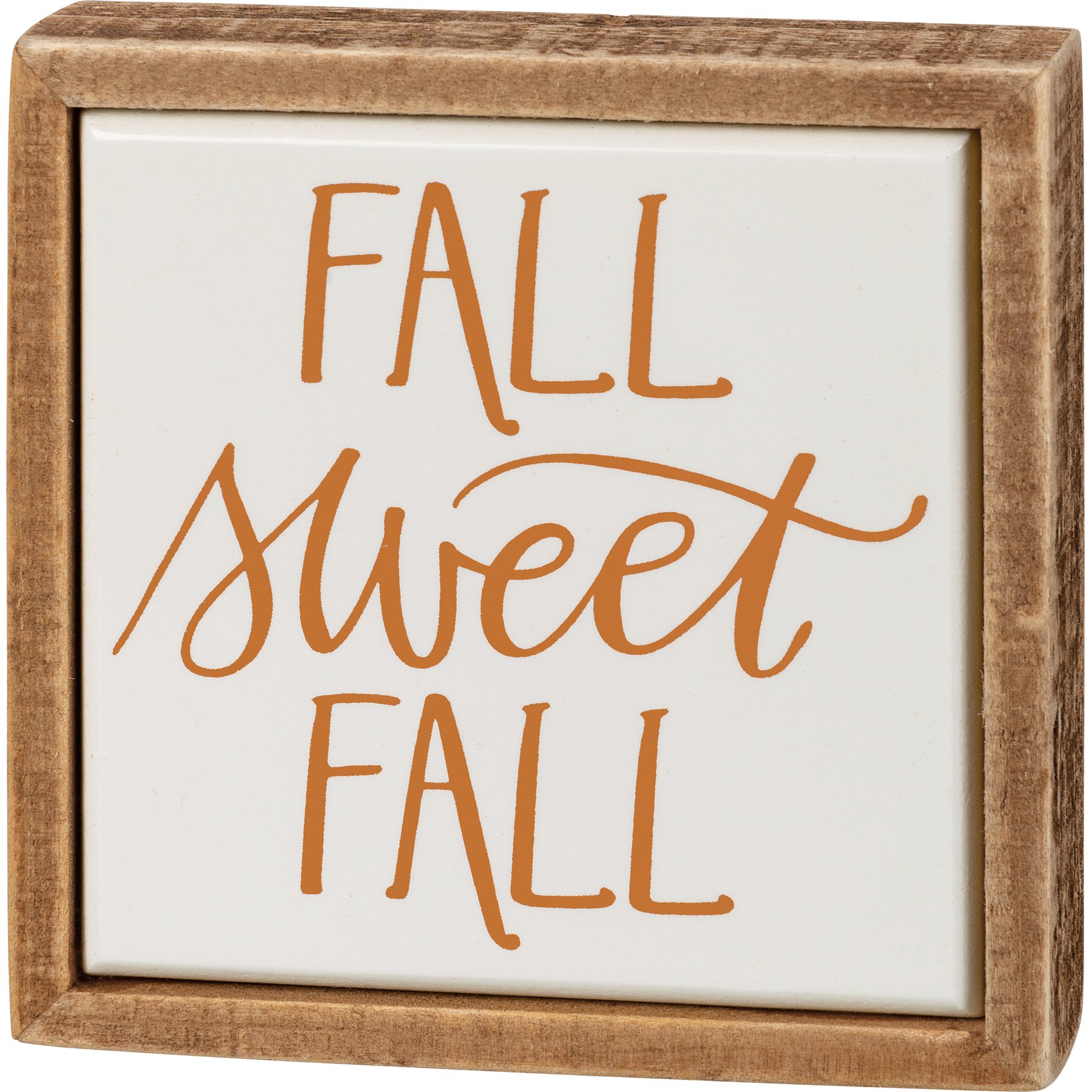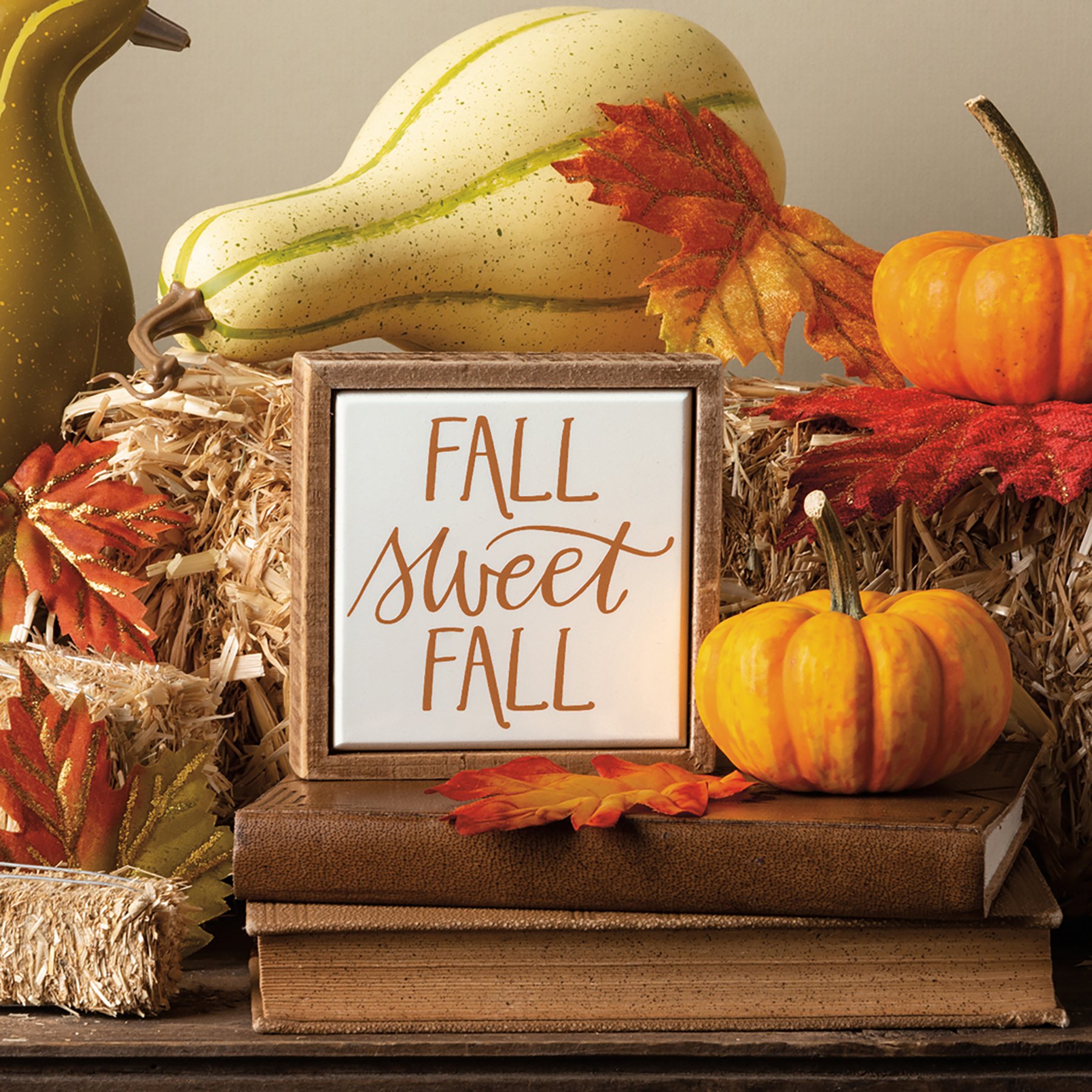 A wooden box sign mini from our Fall & Harvest Collection features a hand lettered "Fall Sweet Fall" sentiment and faux enamel finish for tile-like appearance. The Fall Sweet Fall sign is easy to hang or can free-stand alone.