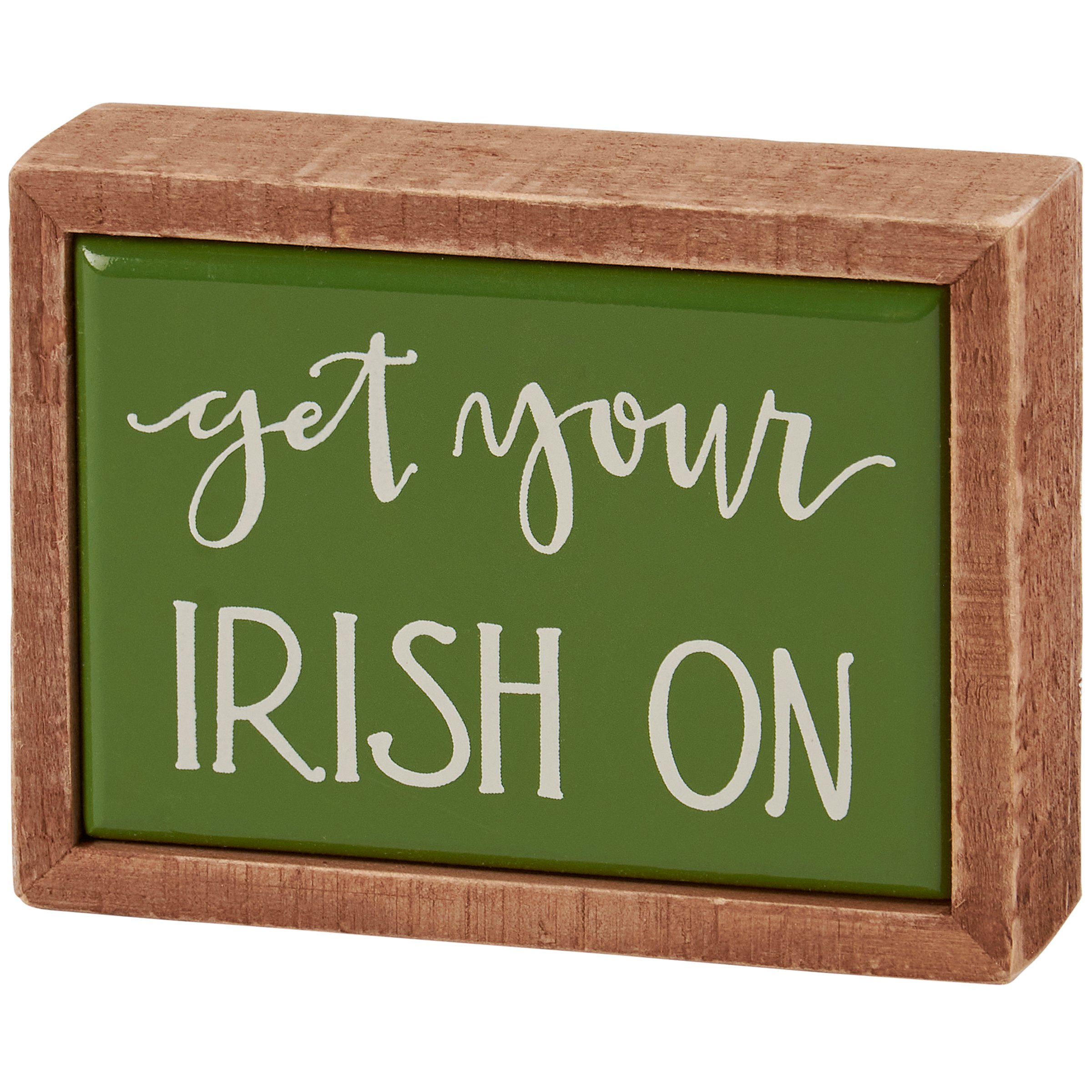 A small wooden box sign from our St. Patrick's Day Collection displaying a unique hand illustrated sentiment on holiday green background that reads "Get Your Irish On." Seasonal mini box sign features a natural wood frame and faux enamel finish behind design for a tile-like appearance. Our Get Your Irish On box sign mini is easy to hang or can free-stand alone. A fun St. Patrick's Day themed home accent that can easily blend into any display.