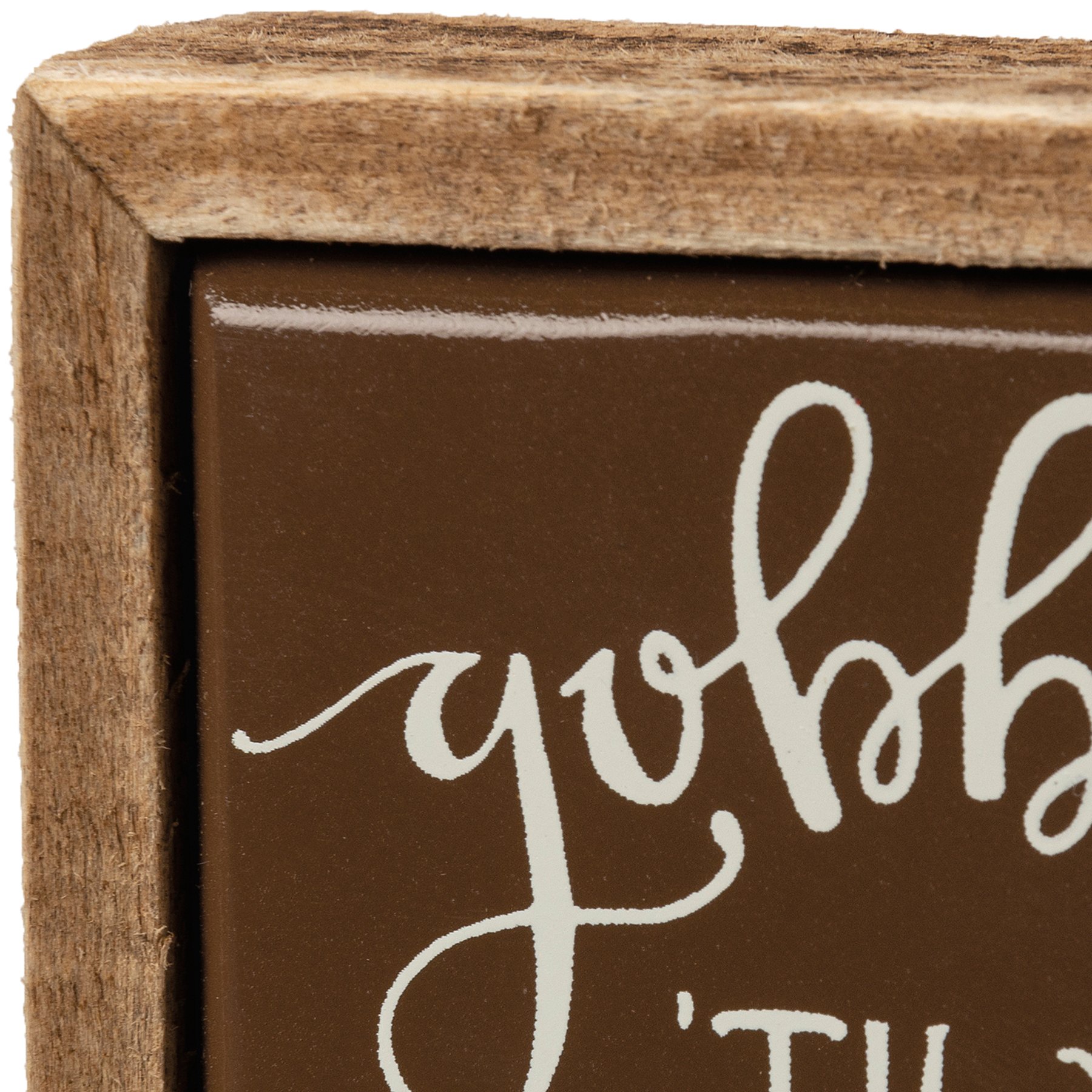 A wooden box sign mini featuring a hand lettered "Gobble 'Til You Wobble" sentiment and tile-like finish. Easy to hang or can free-stand alone.