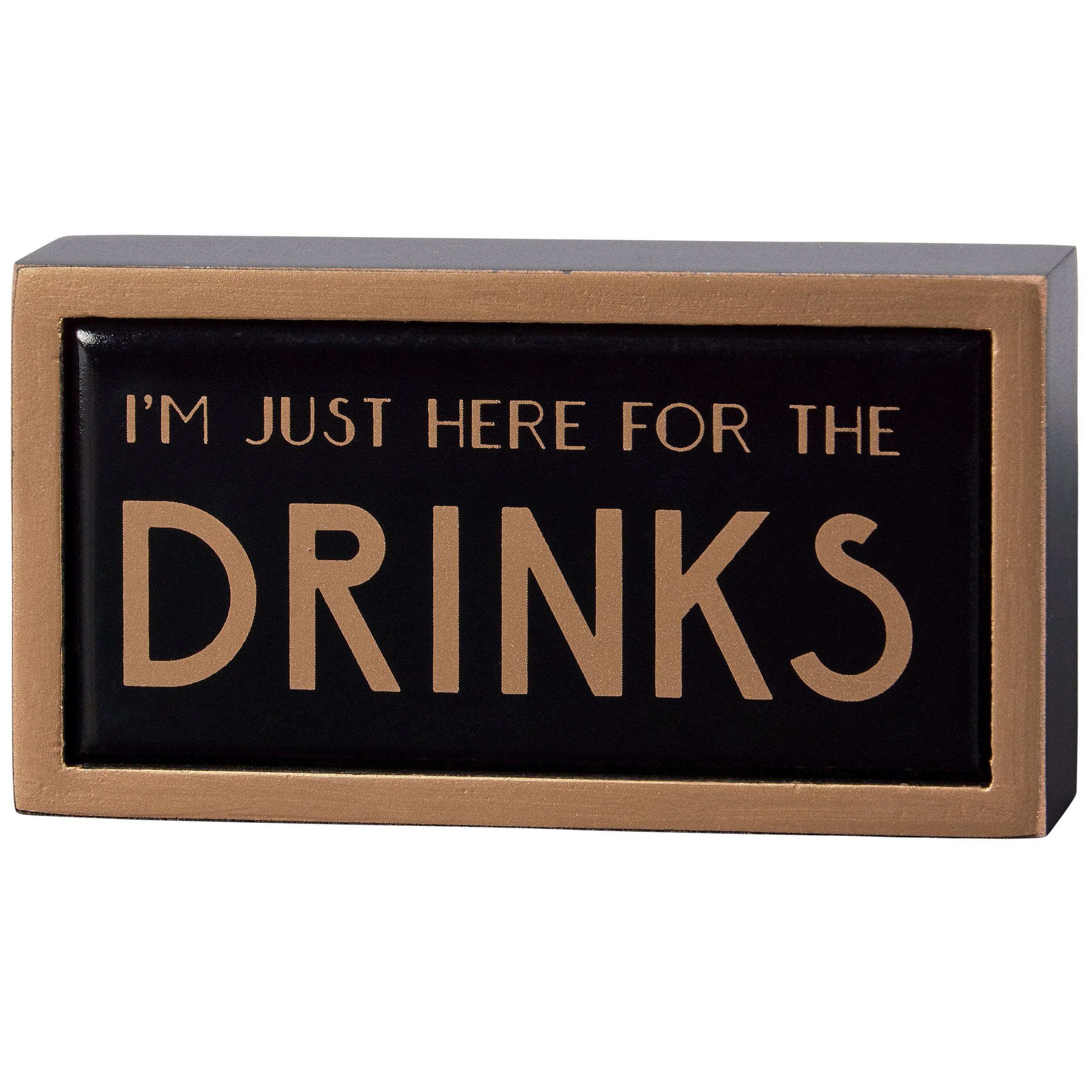 A small wooden box sign from our Art Deco Collection displaying an art deco inspired design with a fun alcohol-themed sentiment that reads "I'm Just Here For The Drinks." Mini bar sign features a black and metallic gold color palette with a faux enamel finish behind design for a tile-like appearance. Our Here For The Drinks sign is easy to hang or can free-stand alone. A fun home accent that coordinates well with bar decor.