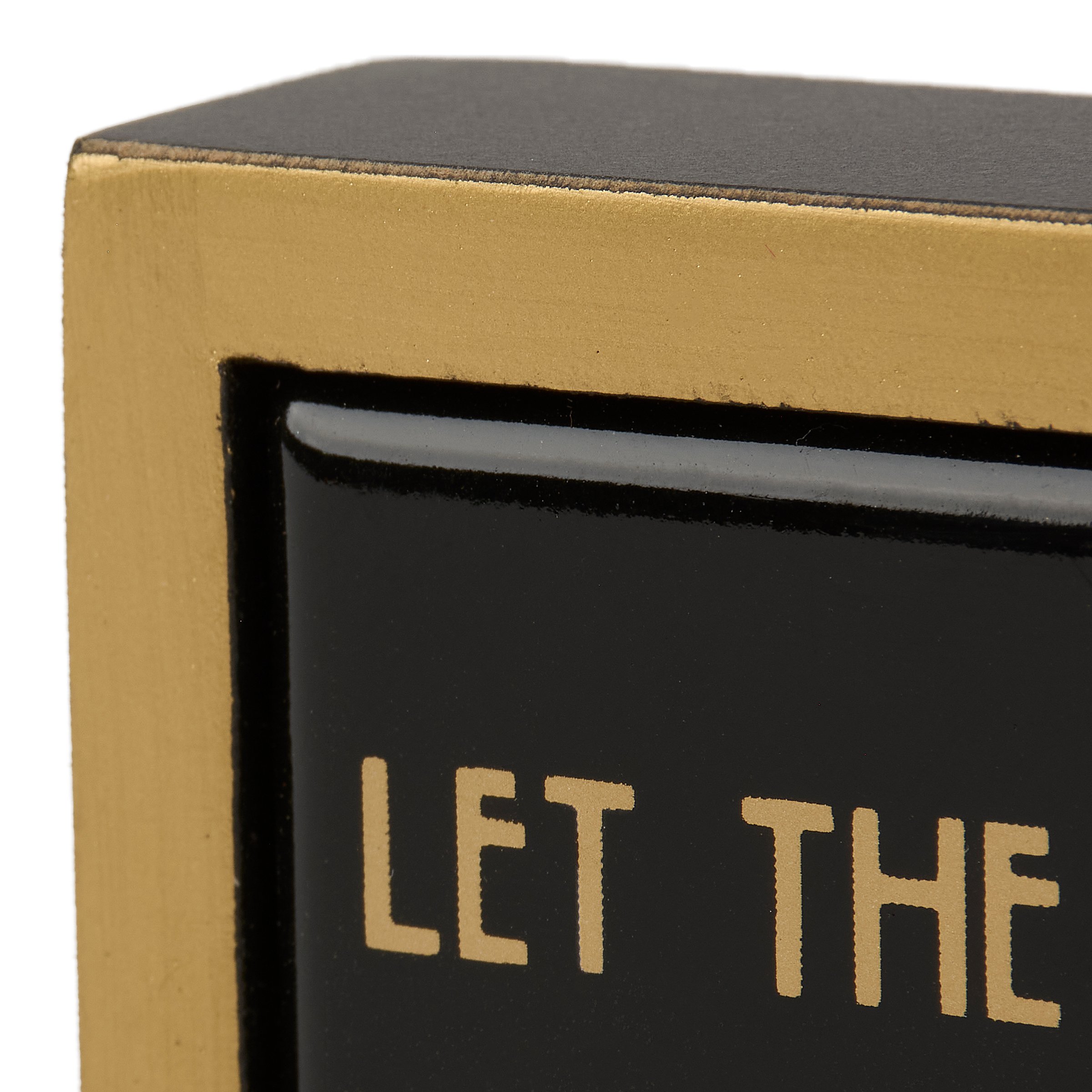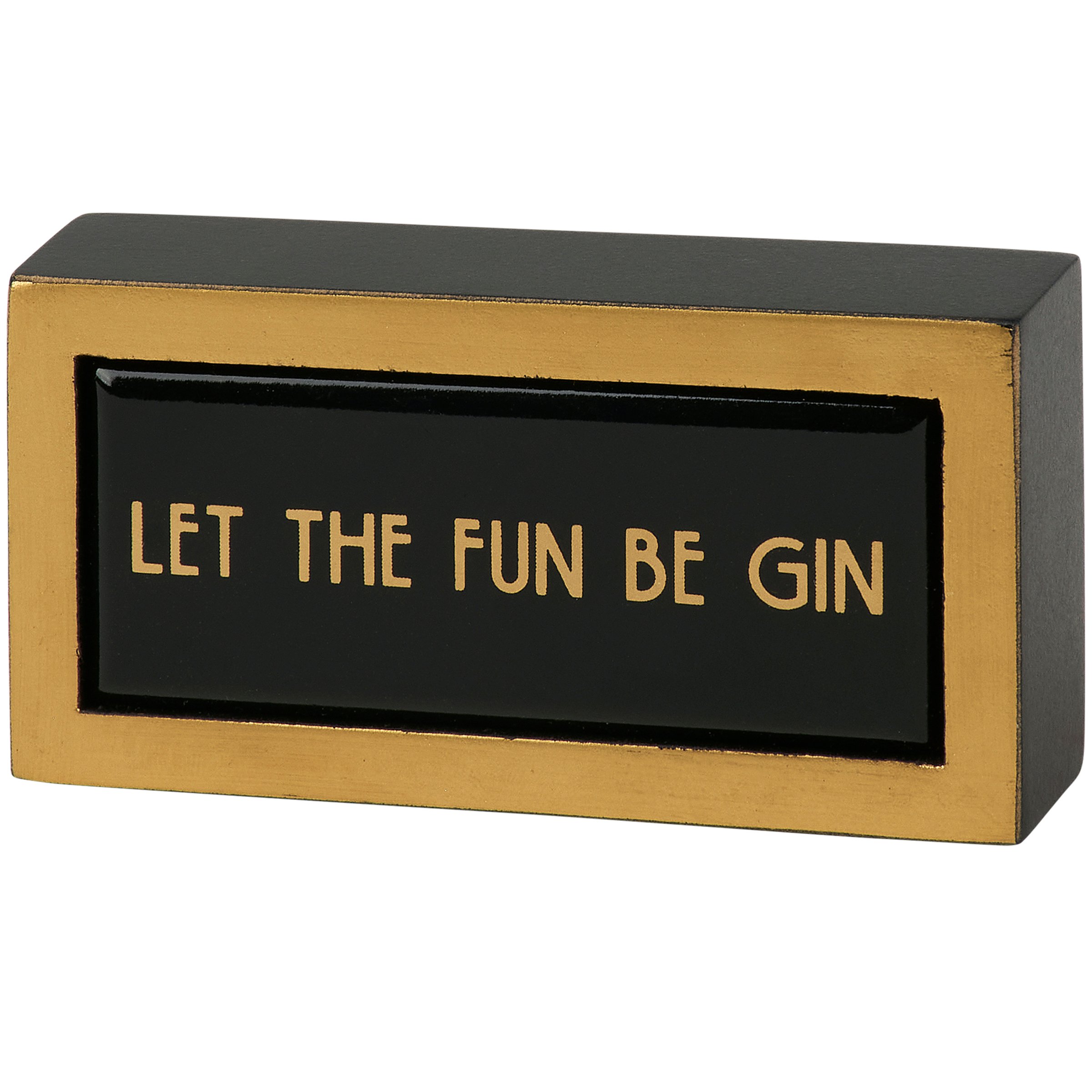 A small wooden box sign from our Art Deco Collection displaying an art deco inspired design with a fun alcohol themed sentiment that reads "Let The Fun Be Gin." Mini bar sign features a black and metallic gold color palette with a faux enamel finish behind design for a tile-like appearance. Our Let The Fun Be Gin sign is easy to hang or can free-stand on a flat surface for display. A fun alcohol themed home accent that adds style and personality to bar decor.