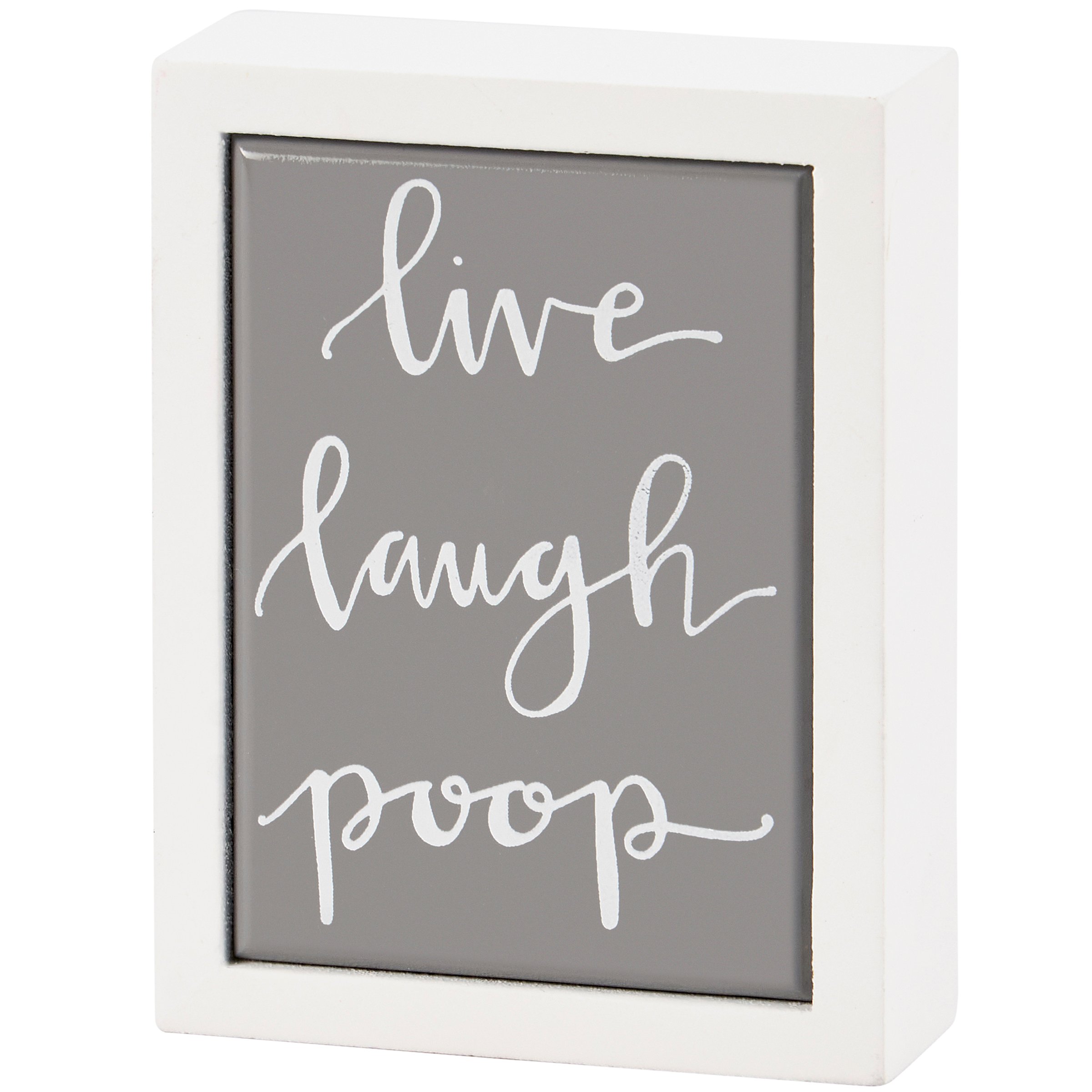 A small wooden box sign from our Bathroom Collection displaying a fun bathroom inspired sentiment that reads "Live Laugh Poop." Bathroom box sign mini features a coordinating clean white color frame. Funny sentiment is made in a unique hand illustrated style on gray color with faux enamel finish for a tile-like appearance that effortlessly blends in with any bathroom. Our Live Laugh mini box sign is easy to hang or can free-stand alone. A funny home accent that can be easily displayed in any bathroom.