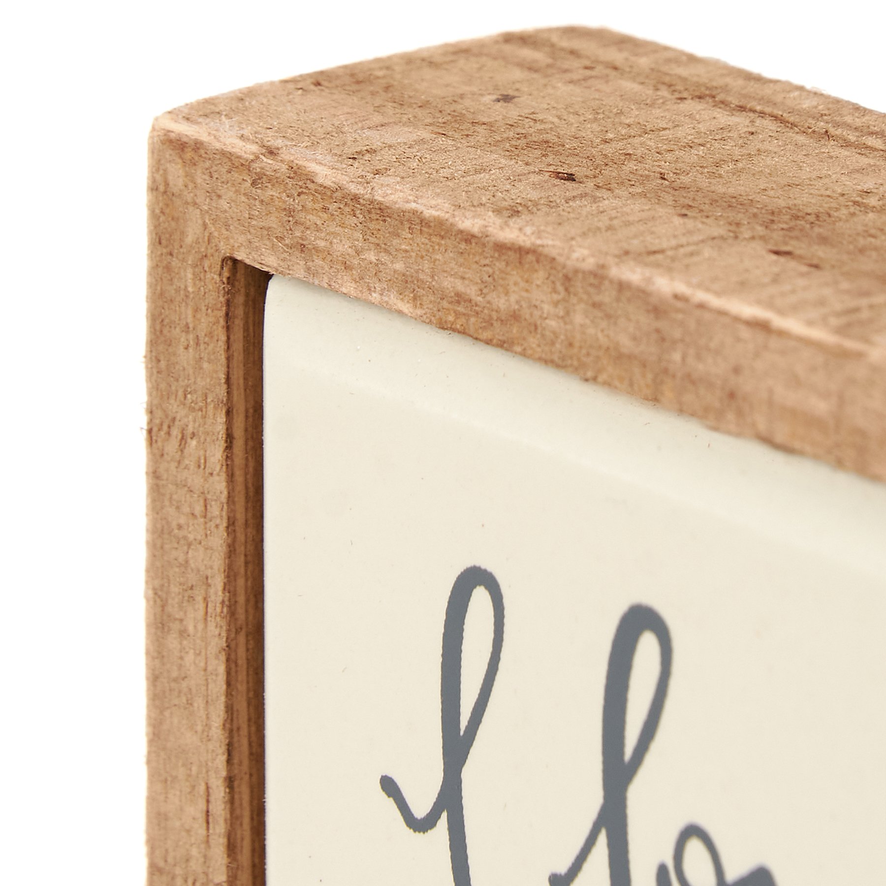 A wooden mini box sign from our Mother's Day Collection displaying a hand illustrated "I Love That You're My Mom" sentiment with faux enamel finish for a tile-like appearance. Our Love That You're My Mom box sign mini is easy to hang or can free-stand alone.