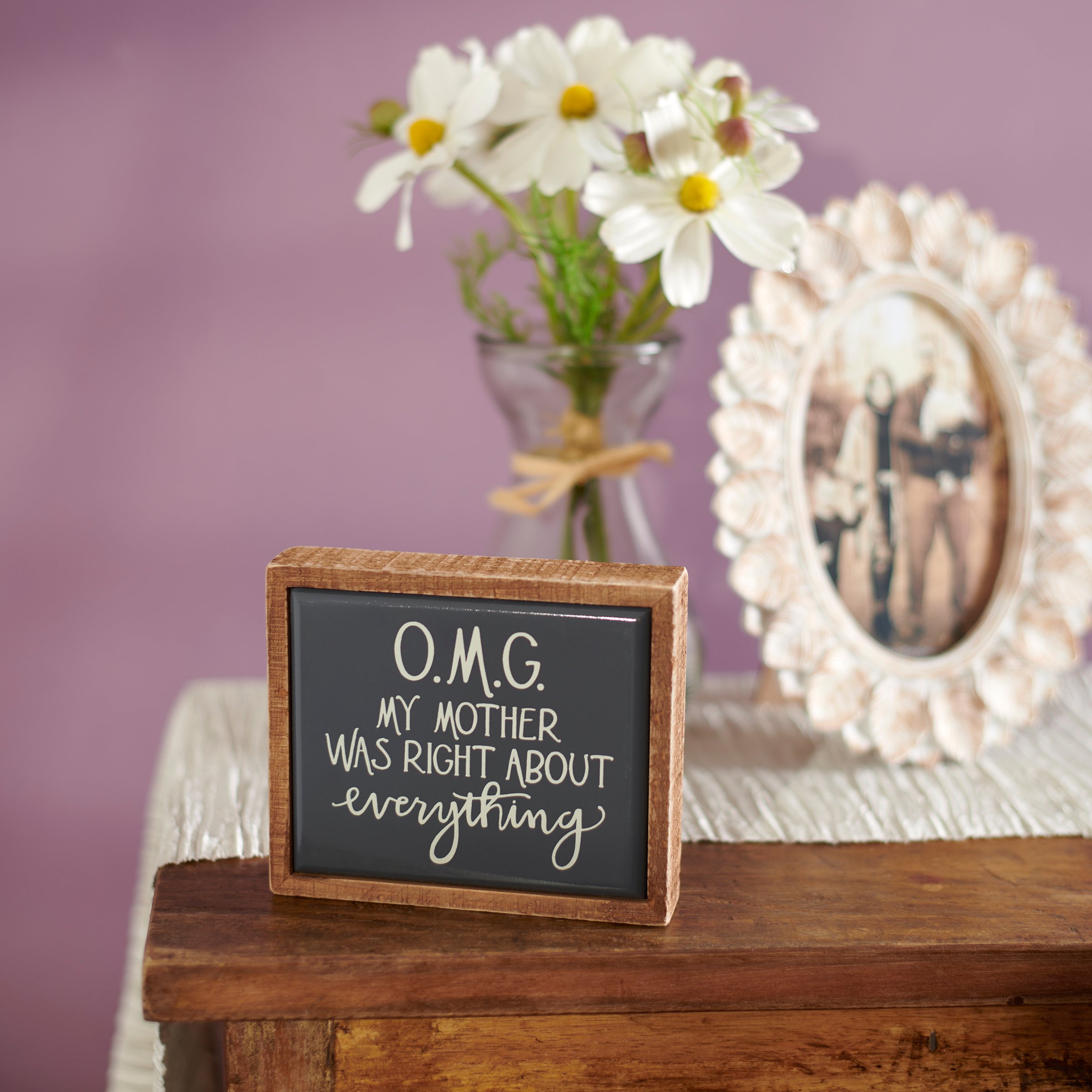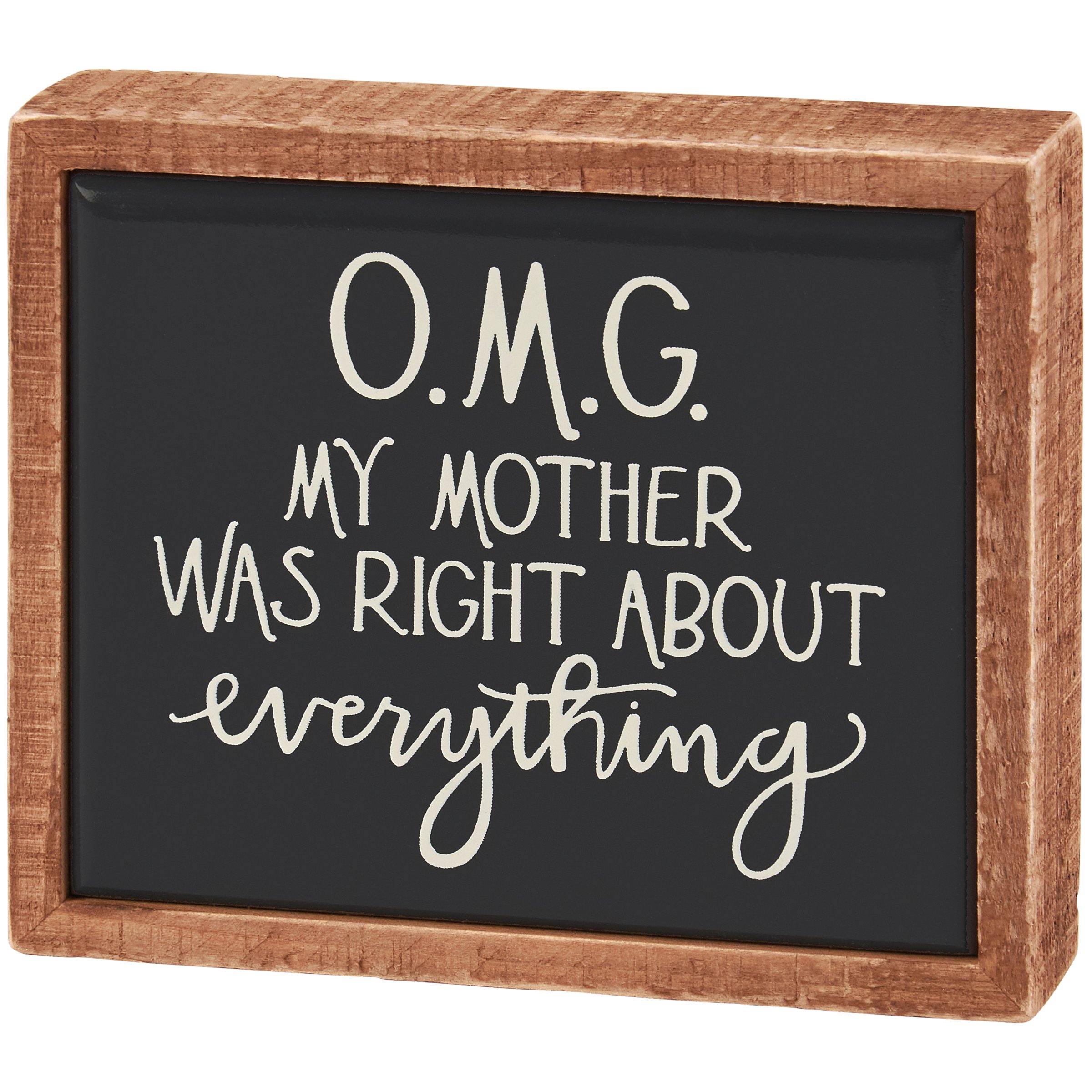 A small wooden box sign from our Mother's Day Collection displaying a fun mom-themed sentiment in a hand illustrated style that reads "O.M.G. My Mother Was Right About Everything." Mom box sign mini features a natural wood frame and faux enamel finish behind design for a tile-like appearance. Our OMG My Mother Was Right mini box sign is easy to hang or can free-stand alone. A fun Mother's Day gift that can easily blend into any display.