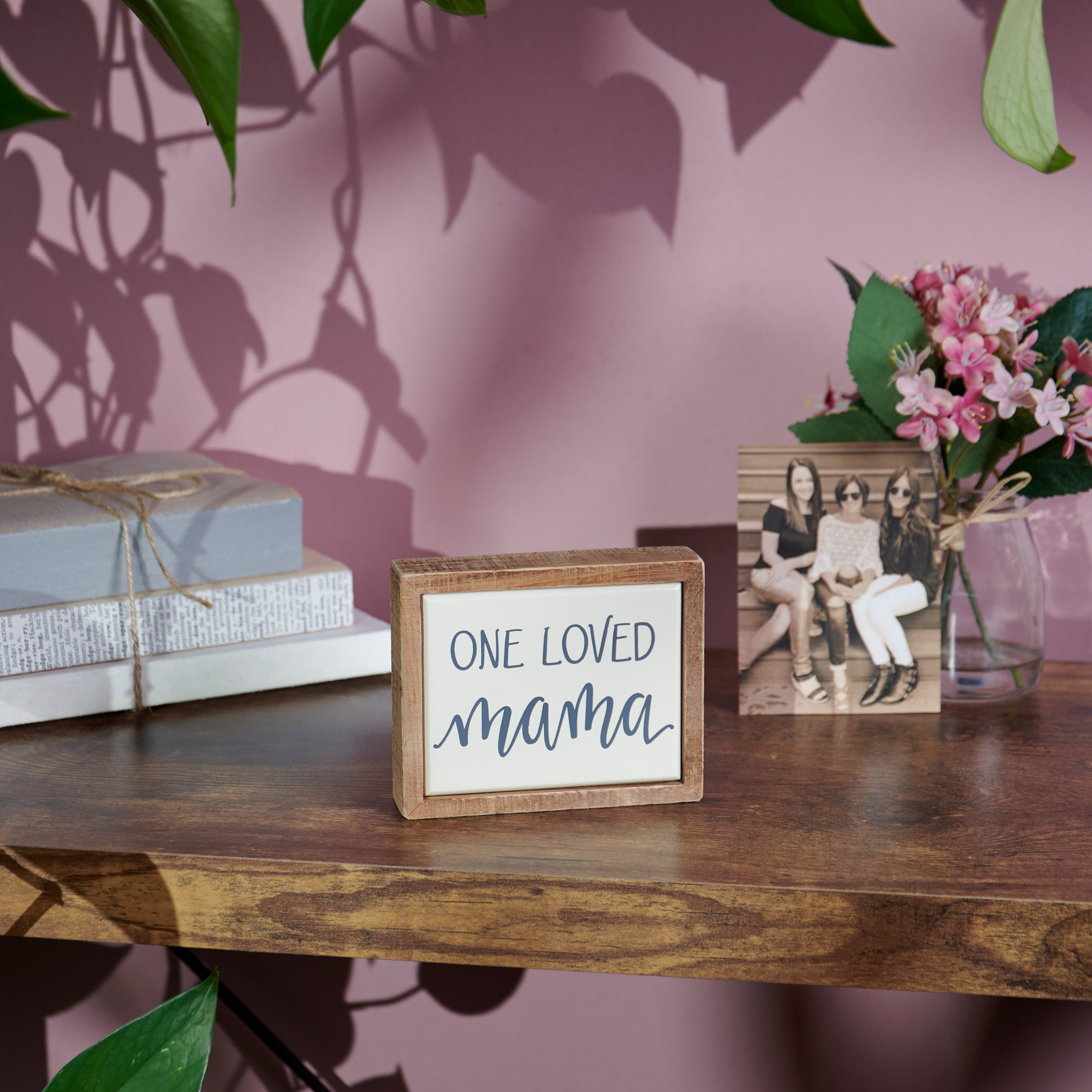 A small wooden box sign from our Mother's Day Collection displaying a fun mom-themed sentiment in a unique hand illustrated style that reads "One Loved Mama." Box sign features a natural wood frame and faux enamel finish behind design for a tile-like appearance. Our One Loved Mama box sign mini is easy to hang or can free-stand alone. A fun gift perfect for Mother's Day or as an everyday home accent that can easily blend into any display.