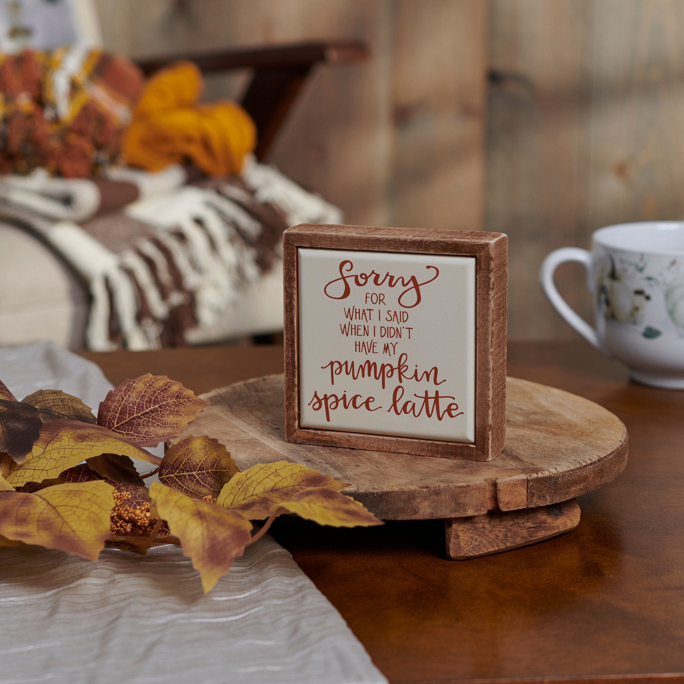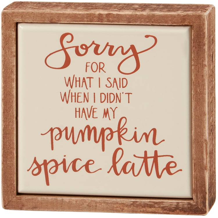 A small wooden box sign from our Fall & Harvest Collection displaying a fun fall inspired sentiment in a unique hand illustrated style that reads "Sorry For What I Said When I Didn't Have My Pumpkin Spice Latte." Box sign features a natural wood frame and faux enamel finish behind design for a tile-like appearance. Our Pumpkin Spice Latte mini sign is easy to hang or can free-stand alone. A fun gift perfect as a seasonal home accent that can easily blend into any display.