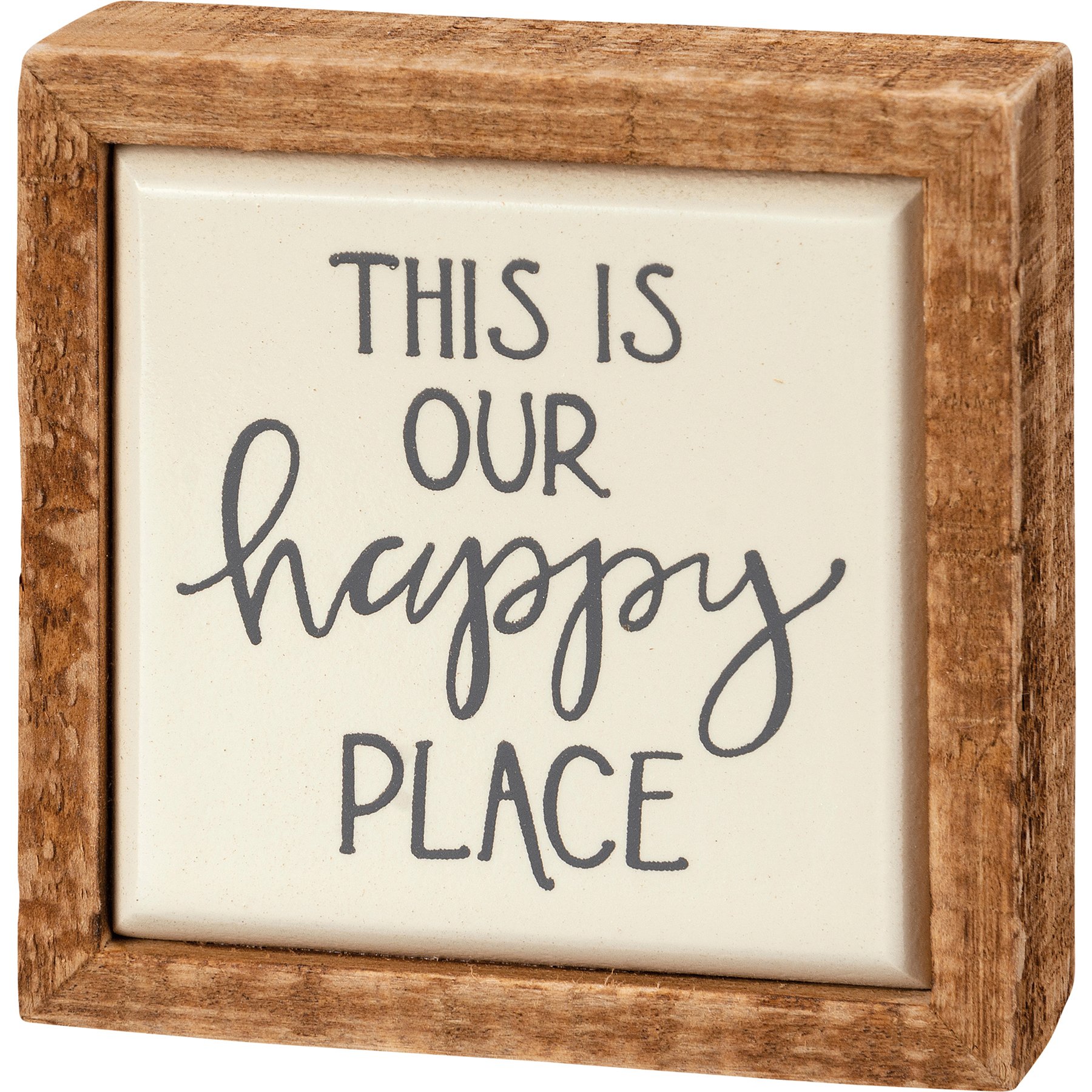 A wooden box sign mini from our Hand Illustrated Collection featuring a hand lettered "This Is Our Happy Place" sentiment and tile-like faux enamel finish for added appeal. Our mini This Is Our Happy Place sign is easy to hang or can free-stand alone.