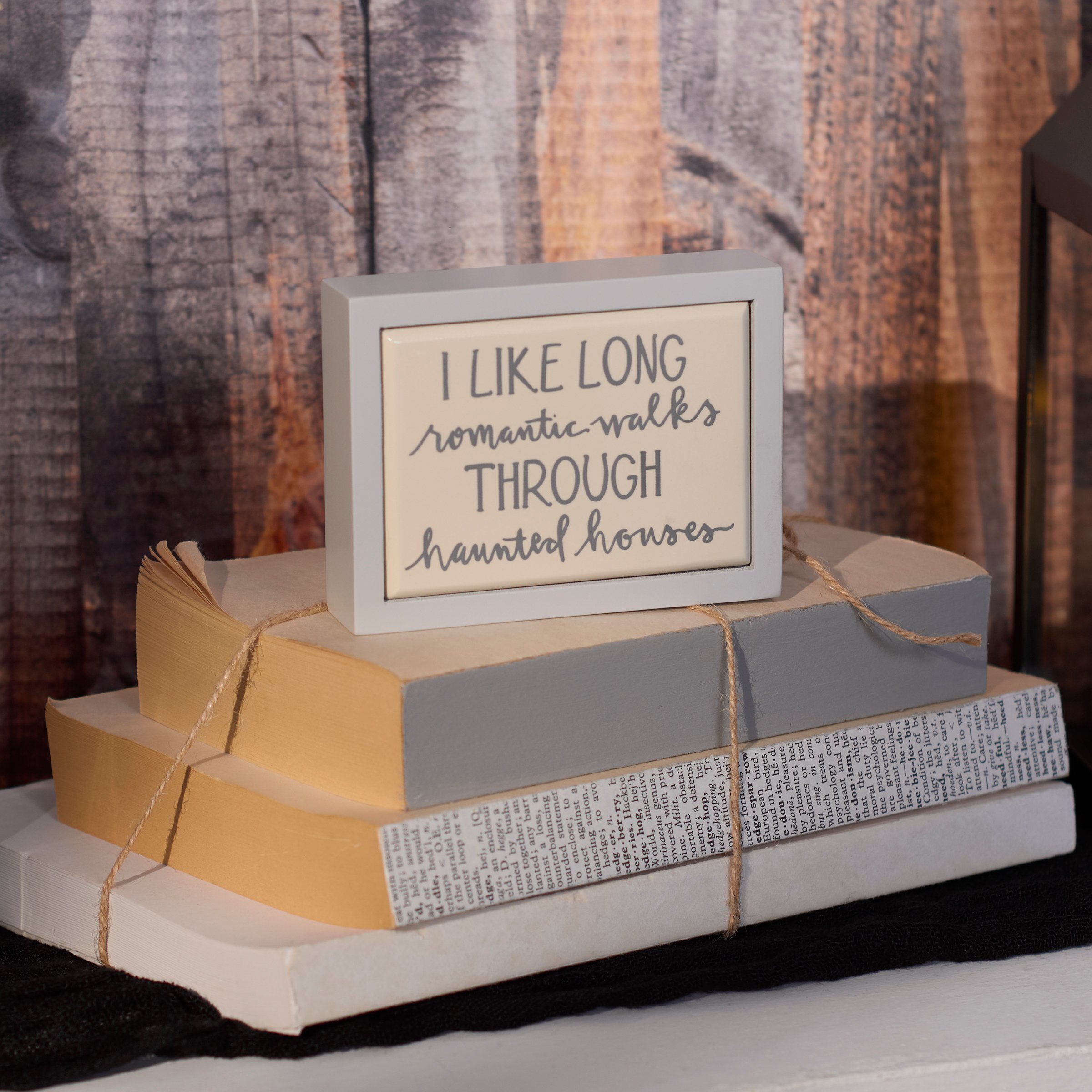 A small wooden box sign from our Haunted White Collection displaying a fun seasonal sentiment in a hand illustrated style on bone white background that reads "I Like Long Romantic Walks Through Haunted Houses." Fun Halloween sign features a coordinating white color frame and faux enamel finish behind design for a tile-like appearance. Our Walks Through Haunted Houses sign is easy to hang or can free-stand alone. A fun Halloween home accent that can easily blend into any seasonal display.
