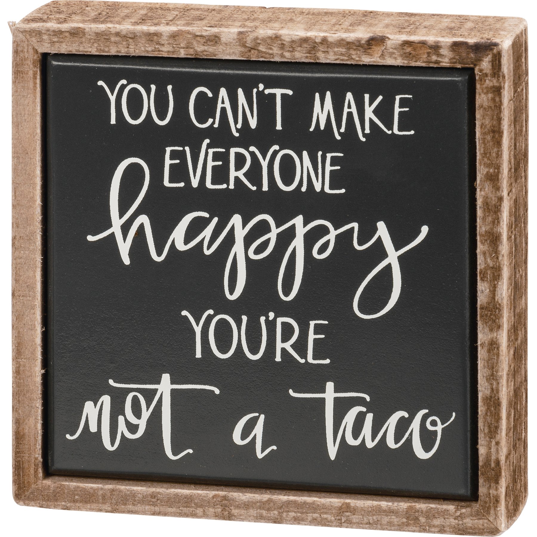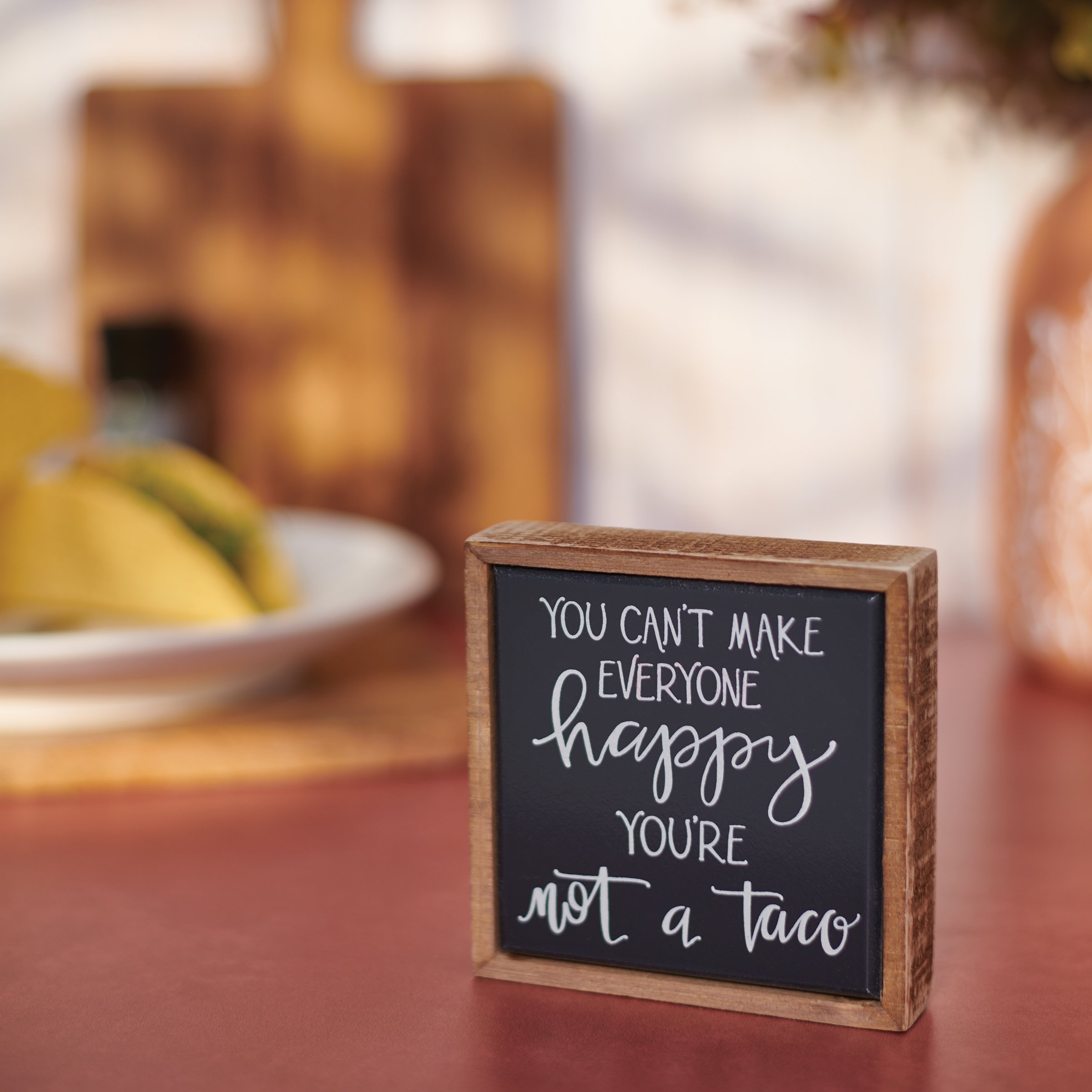 A wooden box sign mini featuring a hand lettered "You Can't Make Everyone Happy You're Not A Taco" sentiment and faux enamel finish for tile-like appearance. Easy to hang or can free-stand alone.
