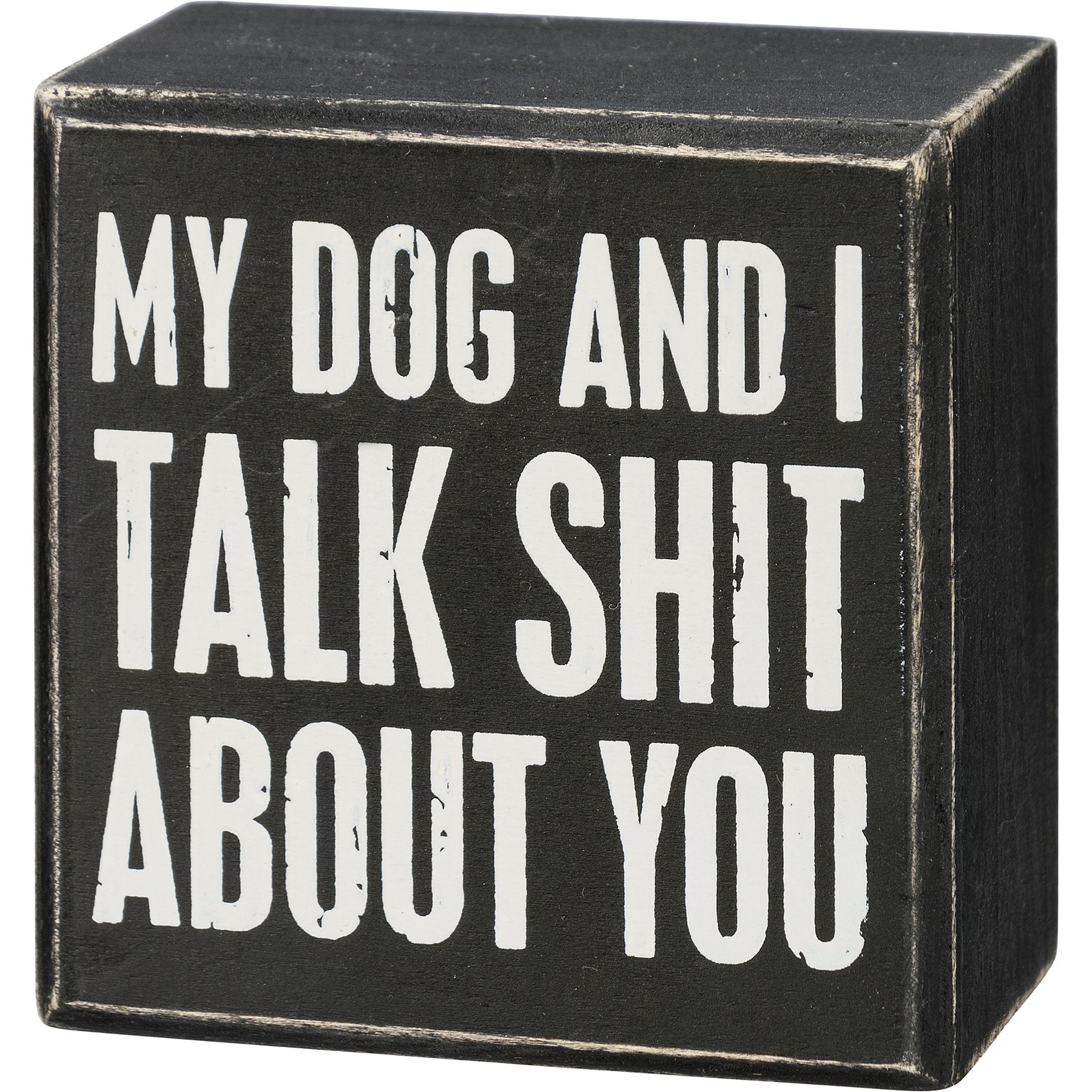 A classic black and white wooden box sign displaying a sarcastic pet inspired sentiment that reads "My Dog And I Talk Shit About You." Funny pet box sign features distressed details with coordinating black color on sides and back. Our My Dog And I sign is easy to hang or can free-stand alone. A fun pet-themed gift that can be easily displayed in any home or work space.