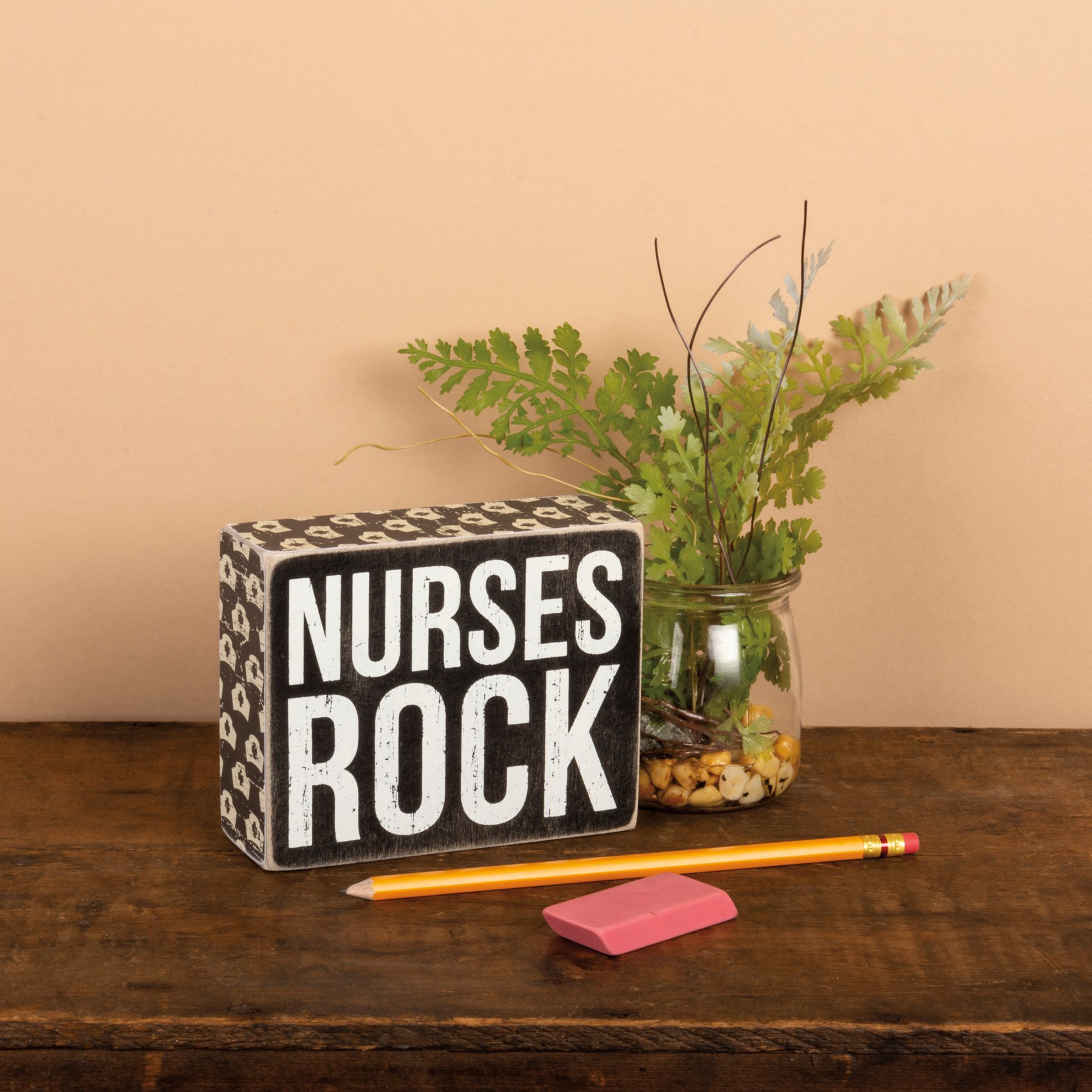 Celebrate healthcare workers with this easy to hang box sign from our Nurse Collection displaying a classic black and white box sign style with distressed details and "Nurses Rock" sentiment. Box sign features coordinating black color and nurse cap pattern on sides. Our Nurses Rock box sign is easy to hang or can free-stand alone.