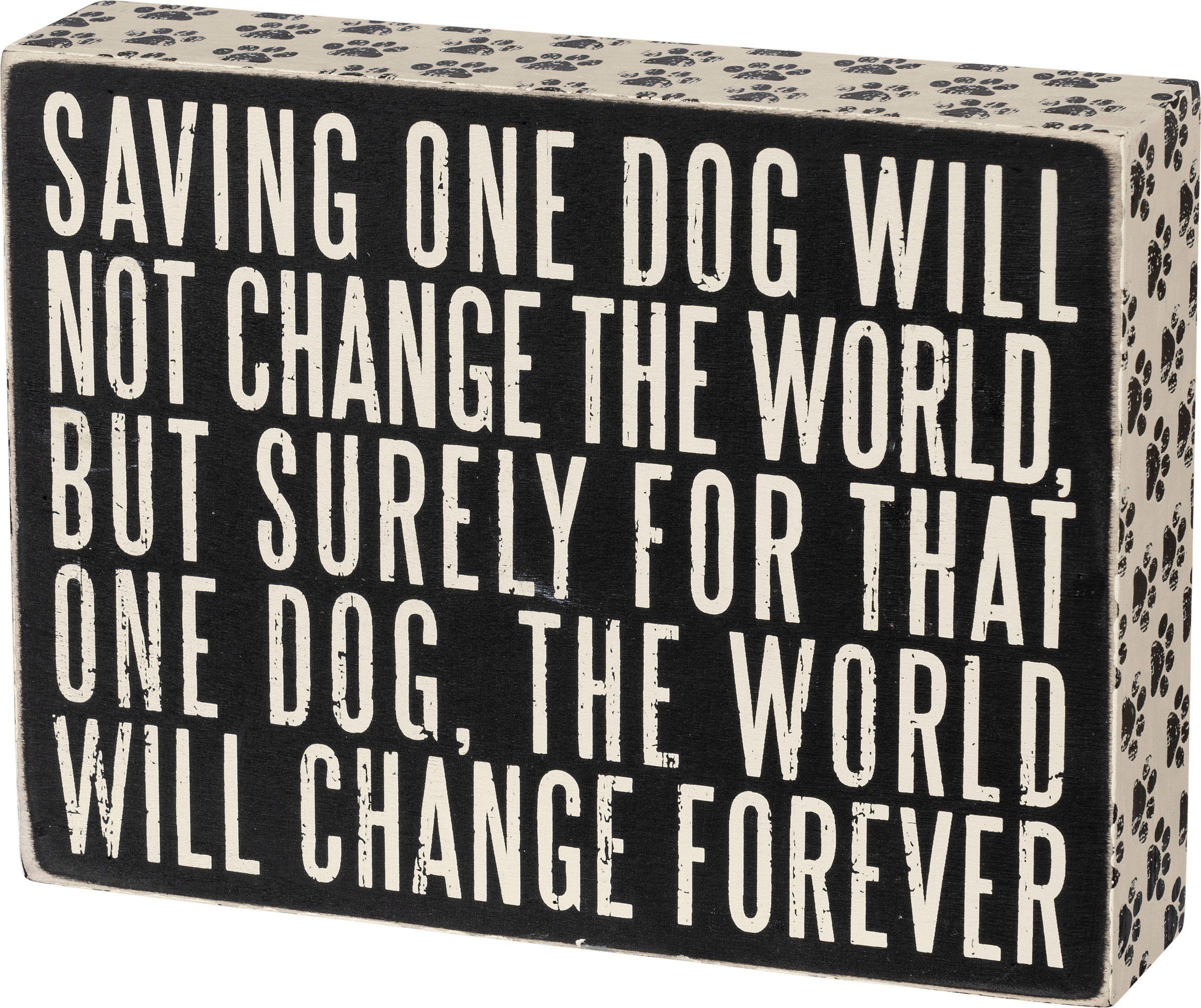 A classic black and white wooden box sign featuring a distressed "Saving One Dog Will Not Change The World - But Surely For That One Dog, The World Will Change Forever" sentiment with paw print trim designs. Our One Dog box sign is easy to hang or can free-stand alone.