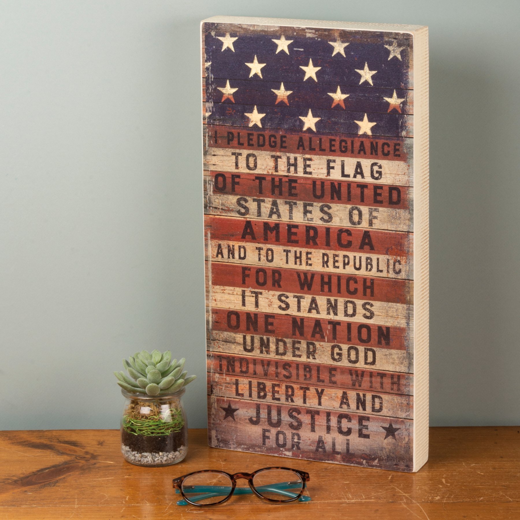 A rustic-inspired wooden box sign featuring a distressed "I Pledge Allegiance To The Flag Of The United States Of America - And To The Republic For Which It Stands - One Nation Under God Indivisible With Liberty And Justice For All" sentiment with flag background design. Easy to hang or can free-stand alone.