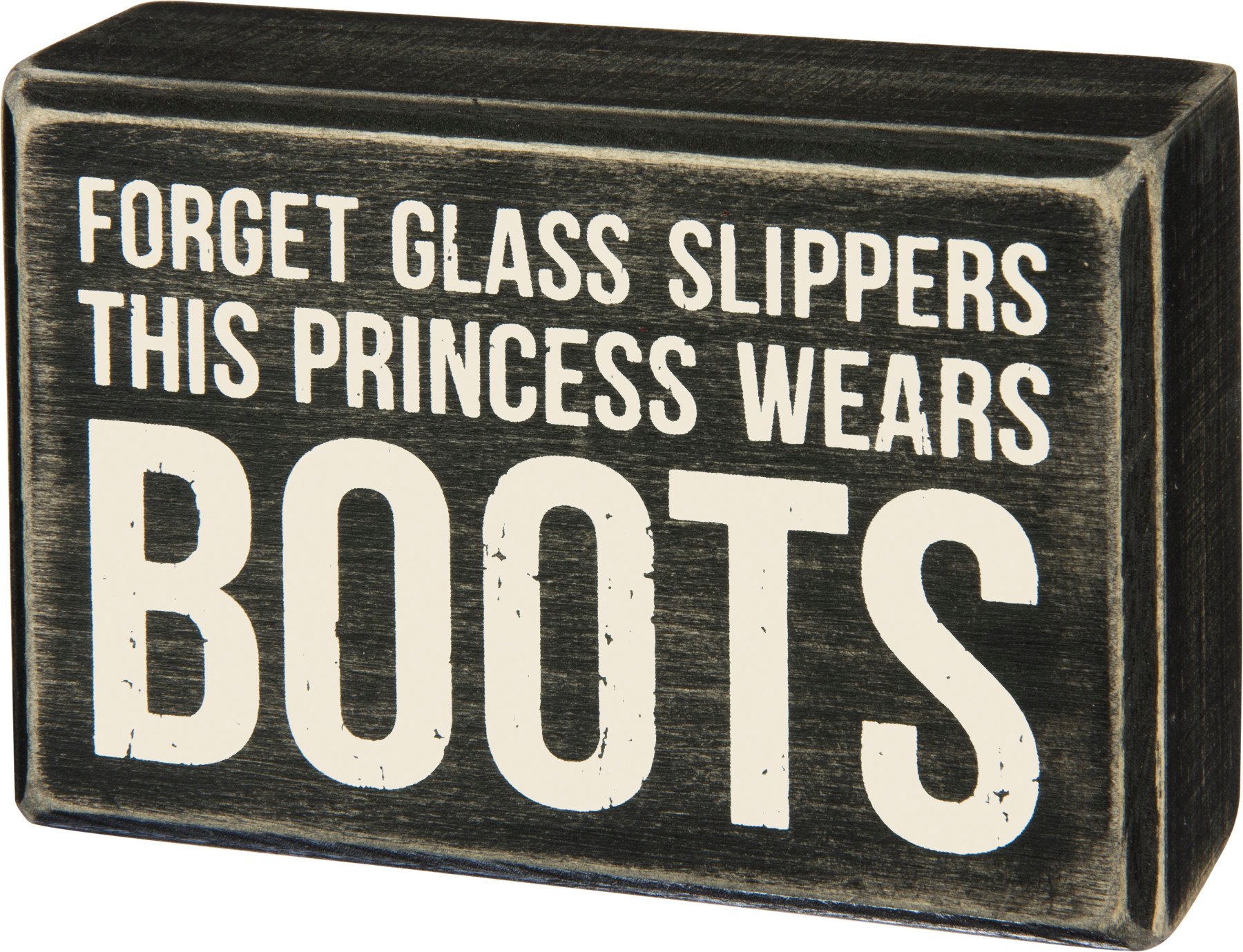 A classic black and white wooden box sign featuring a distressed "Forget Glass Slippers - This Princess Wears Boots" sentiment. Easy to hang or can free-stand alone.