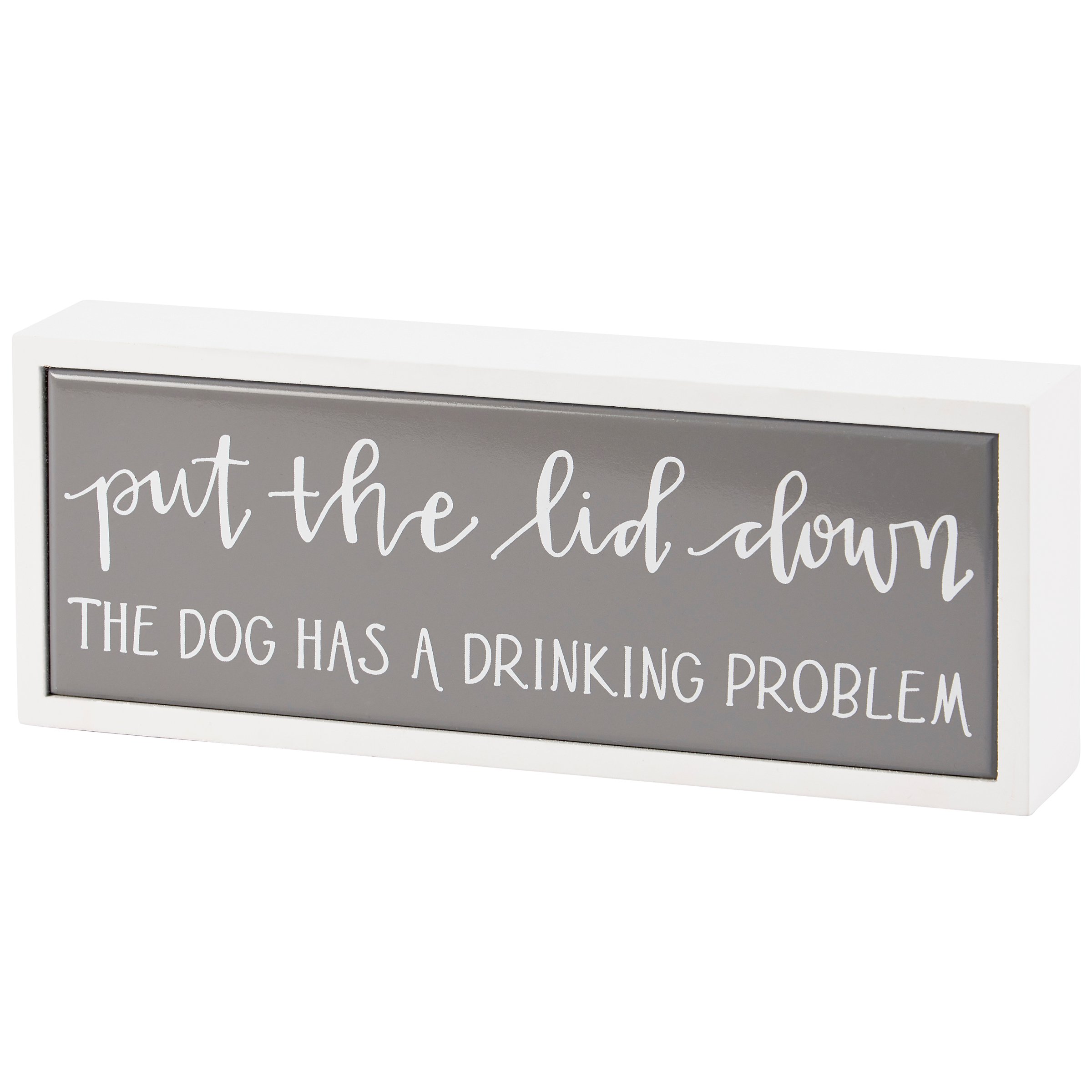 A wooden box sign from our Bathroom Collection displaying a fun bathroom inspired sentiment that reads "Put The Lid Down - The Dog Has A Drinking Problem." Bathroom box sign features a coordinating clean white color frame. Funny sentiment is made in a unique hand illustrated style on gray color with faux enamel finish for a tile-like appearance that effortlessly blends in with any bathroom. Our Put The Lid Down box sign is easy to hang or can free-stand alone. A funny gift that can be easily displayed in any bathroom.