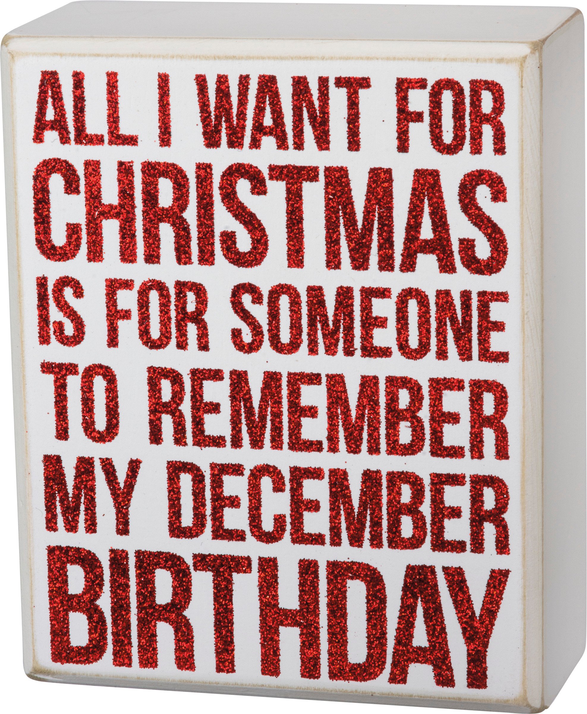 A white wooden box sign featuring an "All I Want For Christmas Is For Someone To Remember My December Birthday" sentiment in red glitter details. This hilarious December Birthday sign is easy to hang or can free-stand alone.