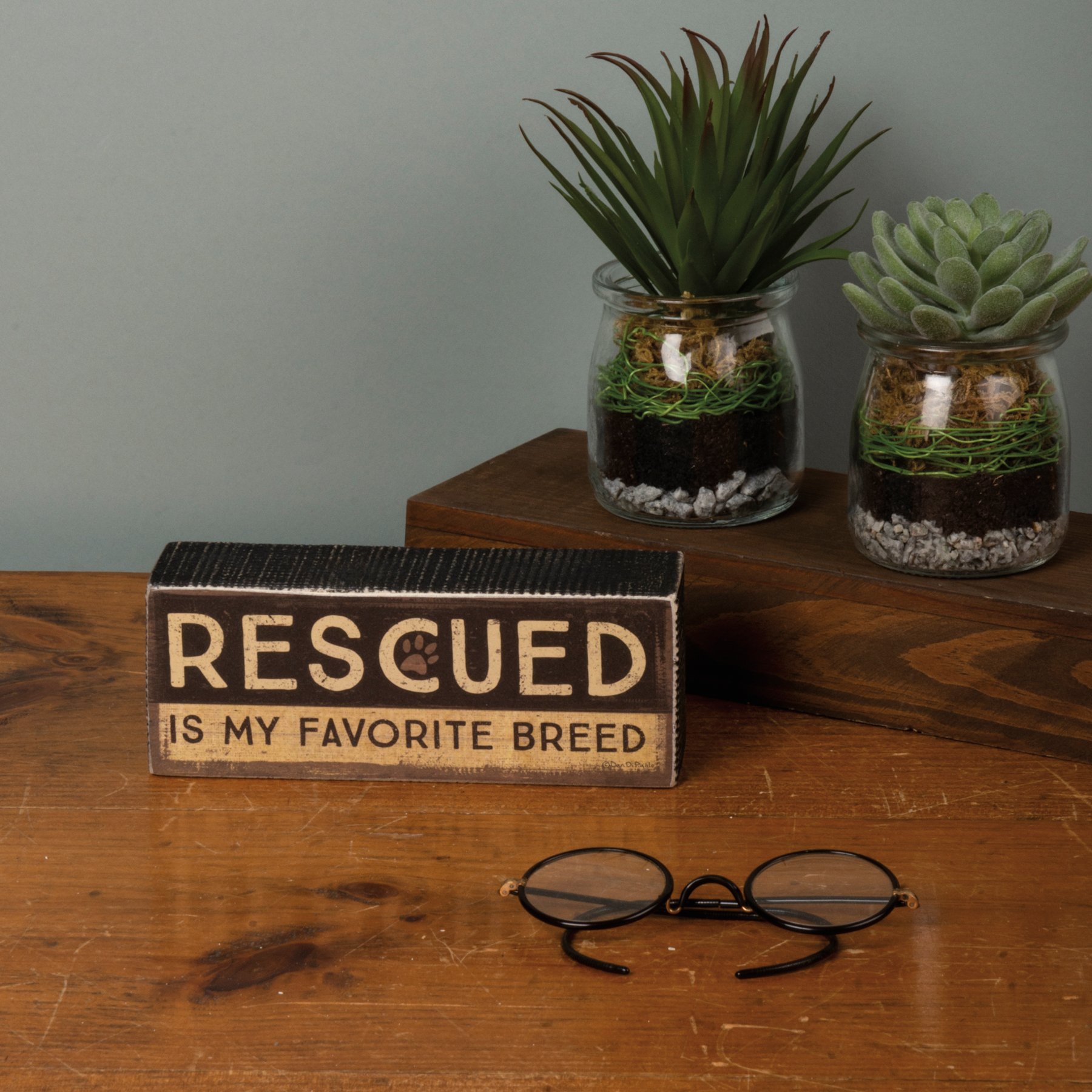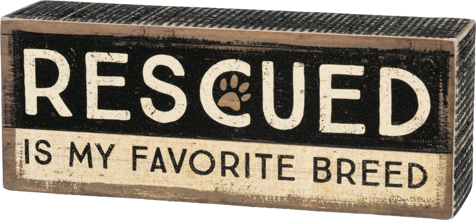 A classic black and white wooden box sign from our Pet Collection displaying a rustic design with a heartwarming pet inspired sentiment that reads "Rescued Is My Favorite Breed." Pet box sign features distressed details with coordinating black color on sides and back. Our Rescued sign is easy to hang or can free-stand alone. A lovely pet-themed gift that can be easily displayed in any home or work space.