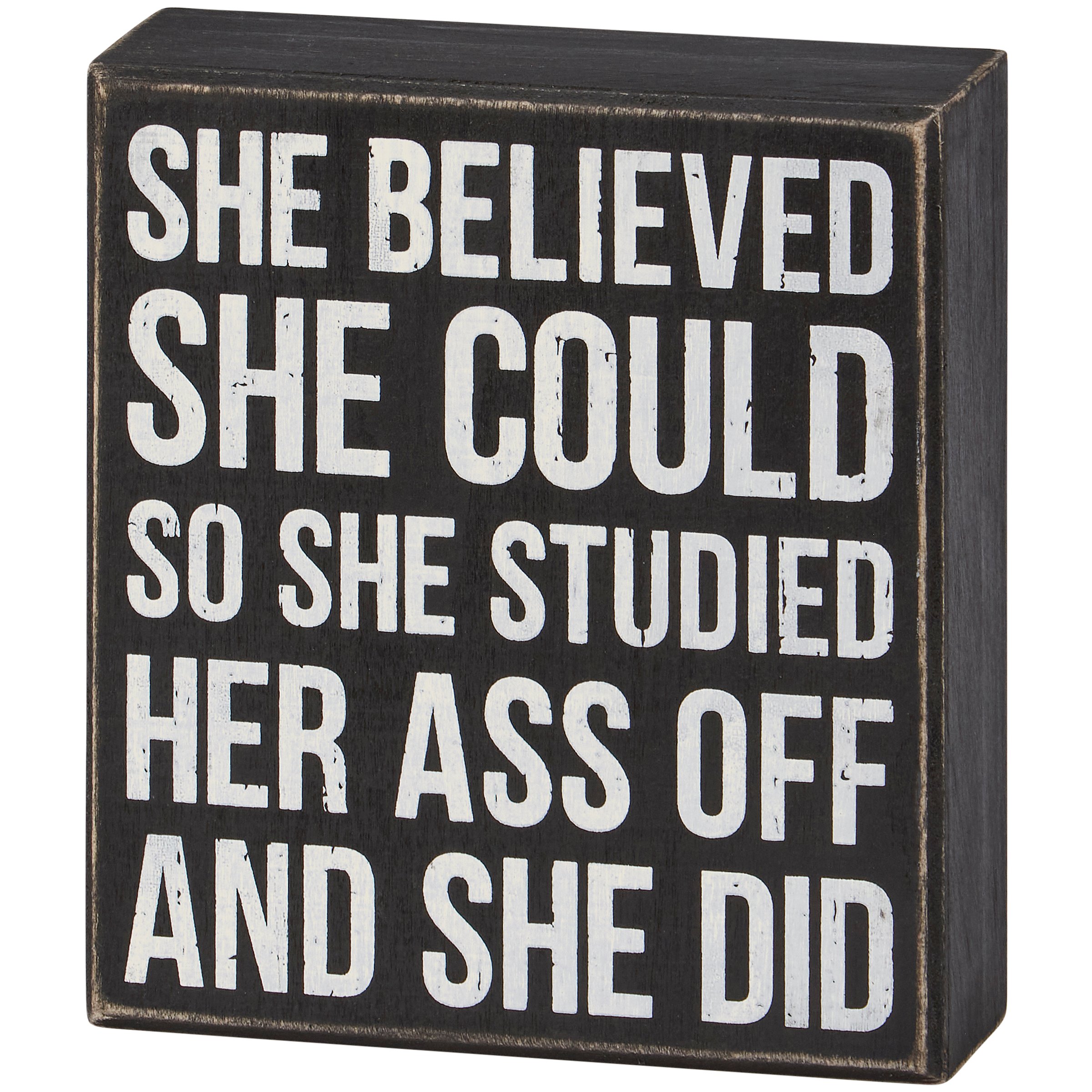 A classic black and white wooden box sign from our Graduation Collection displaying a fun graduation inspired sentiment that reads "She Believed She Could So She Studied Her Ass Off And She Did." Graduation box sign features distressed details with coordinating black color on sides and back. Our She Believed She Could box sign is easy to hang or can free-stand alone. A fun graduation gift that can be easily displayed in any home or work space.