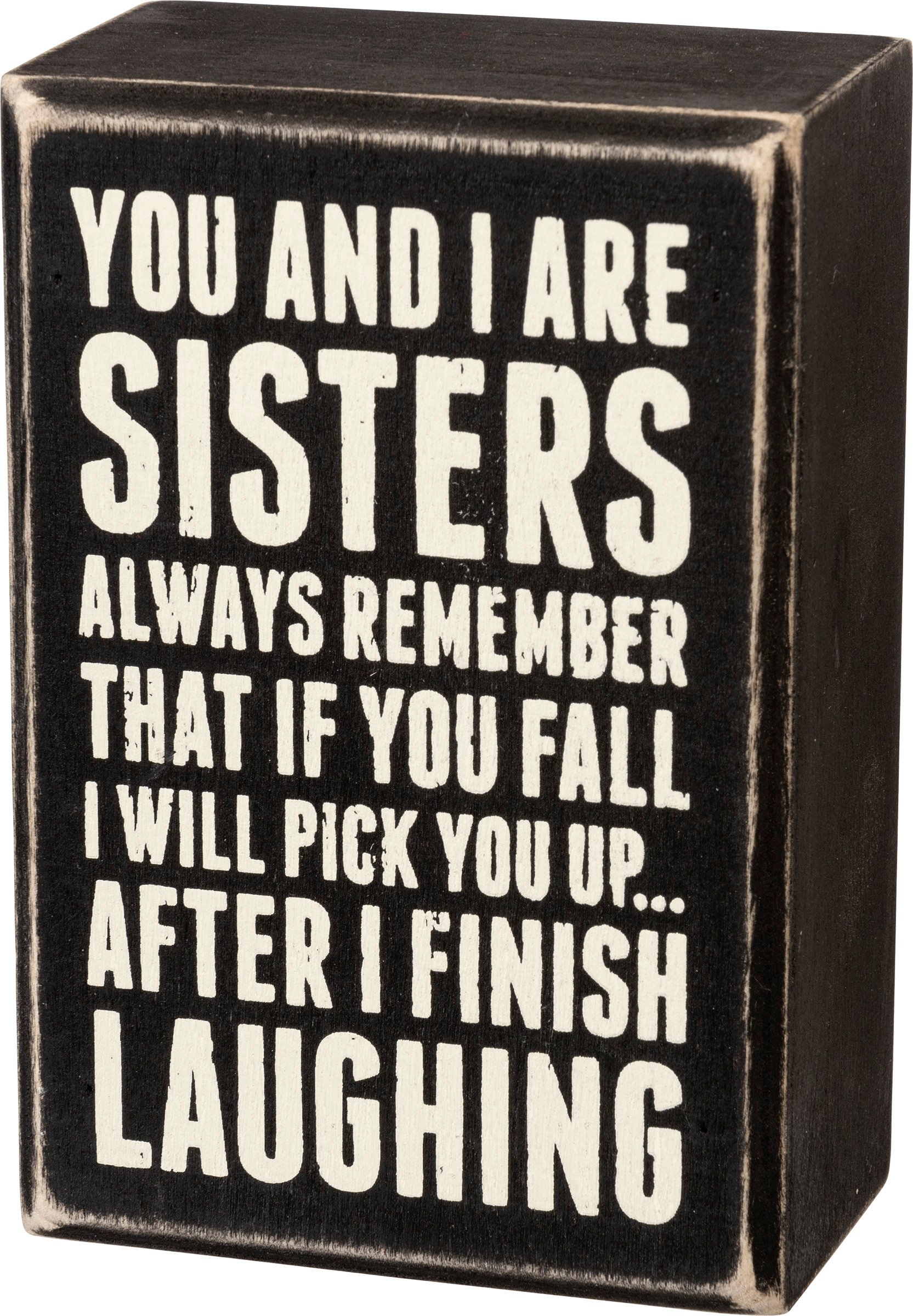 A classic black and white wooden box sign featuring a distressed "You And I Are Sisters - Always Remember That if You Fall I Will Pick You Up… After I Finish Laughing" sentiment. Easy to hang or can free-stand alone.