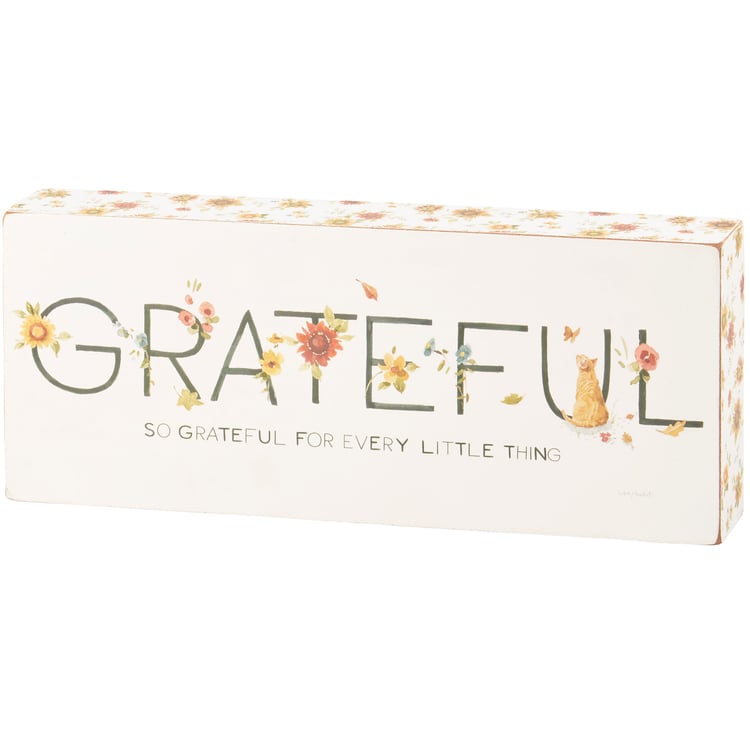 A wooden box sign from our Fall & Harvest Collection displaying hand painted designs of colorful flowers, a butterfly, and a cat on a fall inspired sentiment that reads "Grateful - So Grateful For Every Little Thing." Design is replicated from original art hand painted in a delicate watercolor style. Box sign features a coordinating fall wildflower pattern on the sides and natural wood on the back. Our So Grateful sign is easy to hang or can free-stand alone. An inspirational seasonal home accent great for gifting that can be easily displayed in any home or work space.