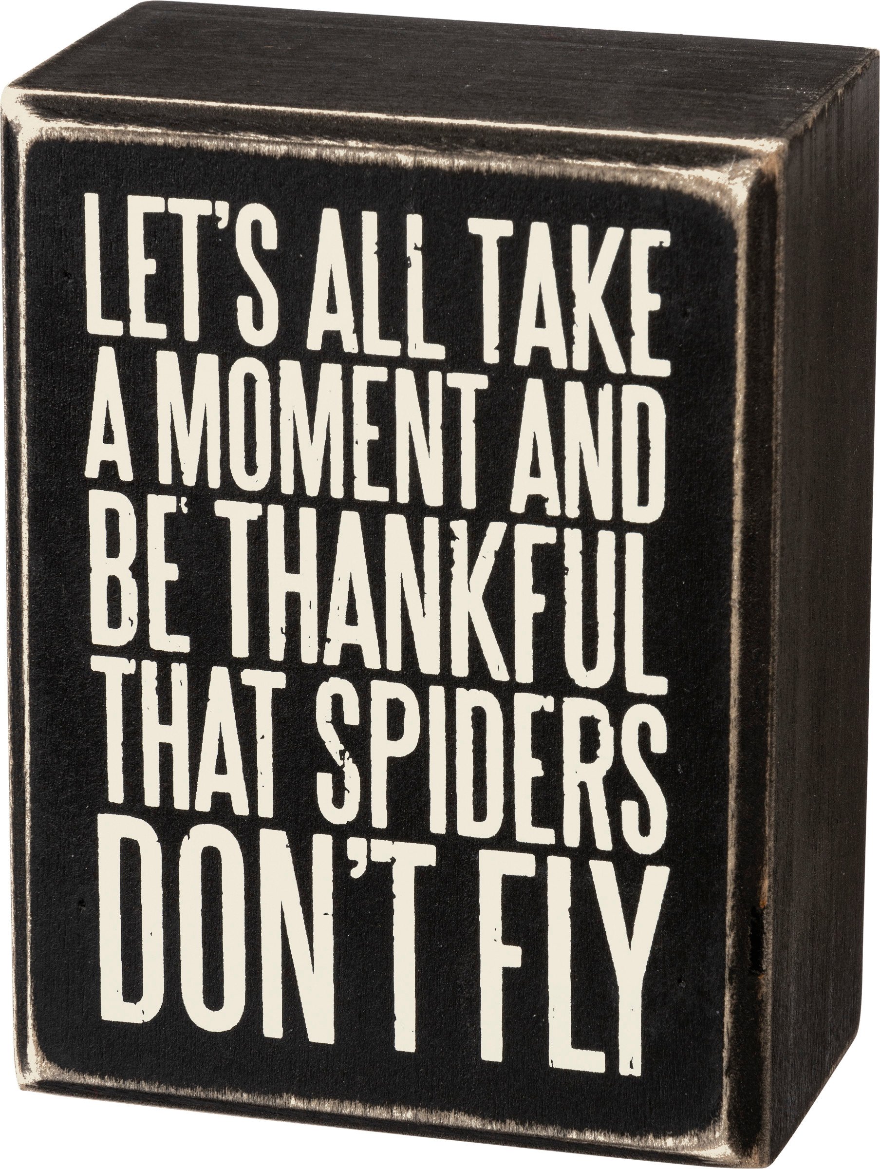 A classic black and white wooden box sign featuring a distressed "Let's All Take A Moment And Be Thankful That Spiders Don't Fly" sentiment. Easy to hang or can free-stand alone.