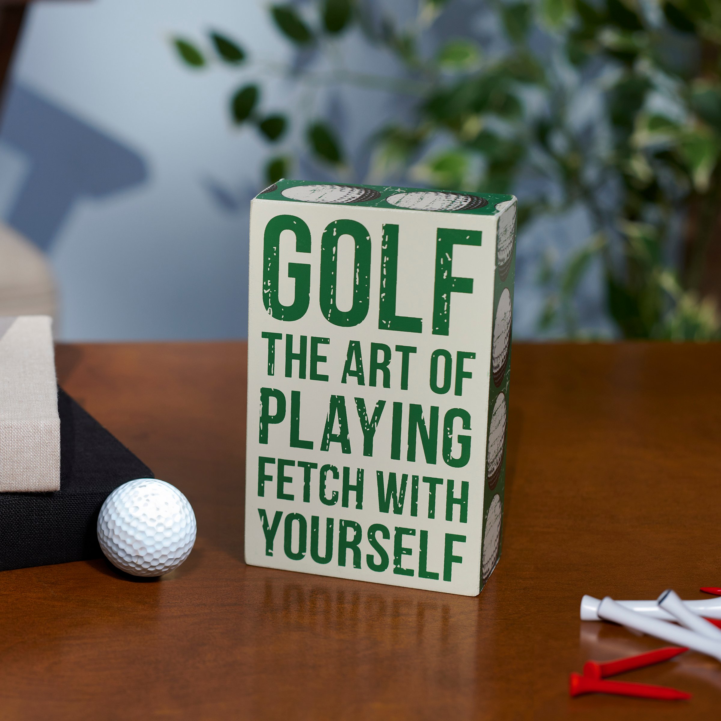 A wooden box sign from our Sports Collection displaying a fun golf inspired sentiment in a classic box sign style that reads "Golf - The Art Of Playing Fetch With Yourself." Funny golf box sign features coordinating green color with golf ball pattern along the sides. Our Art Of Playing Fetch box sign is easy to hang or can free-stand alone. A fun golf-themed gift that can be easily displayed in any home or work space.