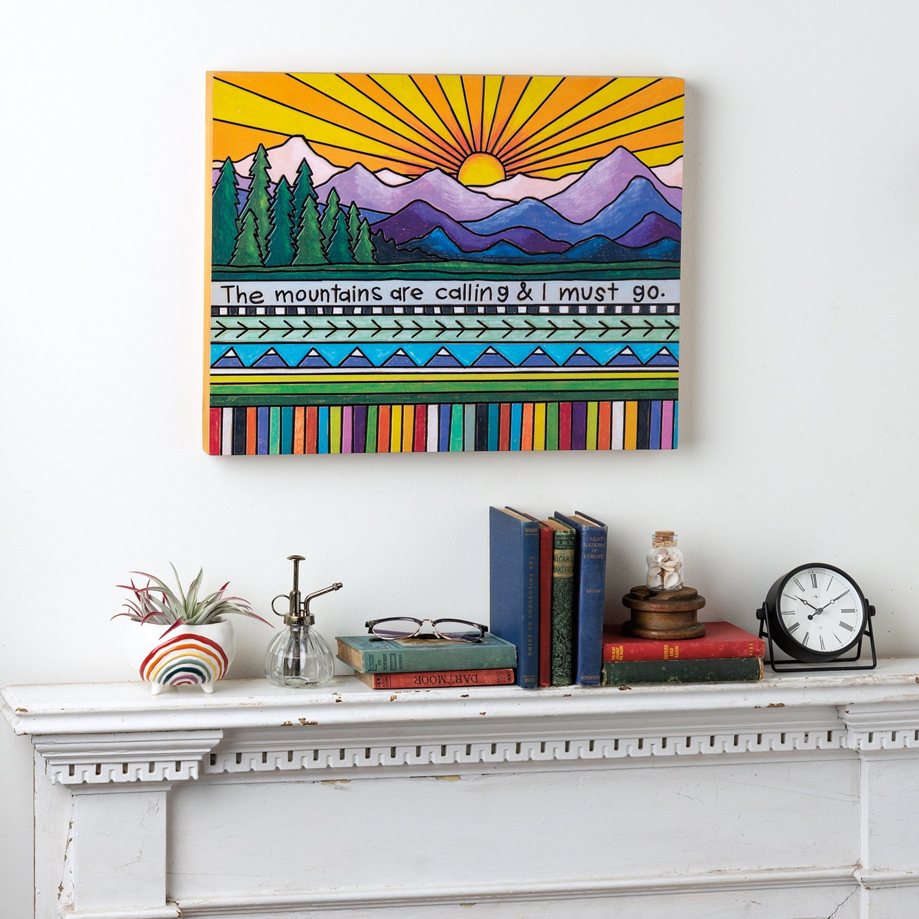 A wooden box sign featuring "The Mountains Are Calling & I Must Go" sentiment, colorful wood burned designs, and natural wood sides for added interest. Our The Mountains Are Calling & I Must Go box sign is easy to hang or can free-stand alone.