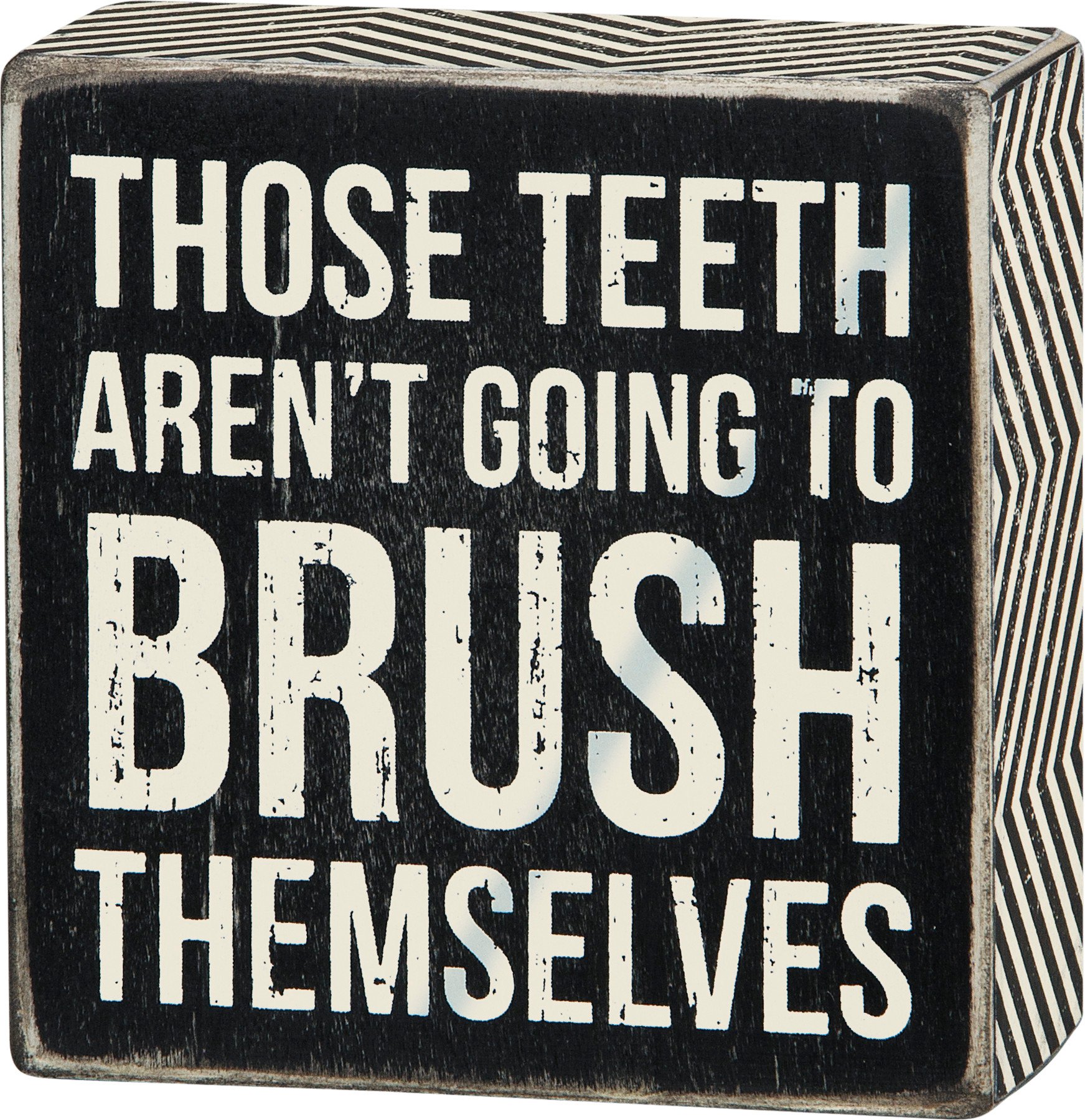 A classic black and white wooden box sign featuring a distressed "Those Teeth Aren't Going To Brush Themselves" sentiment with zigzag trim designs. Easy to hang or can free-stand alone. Not eligible for discounting.