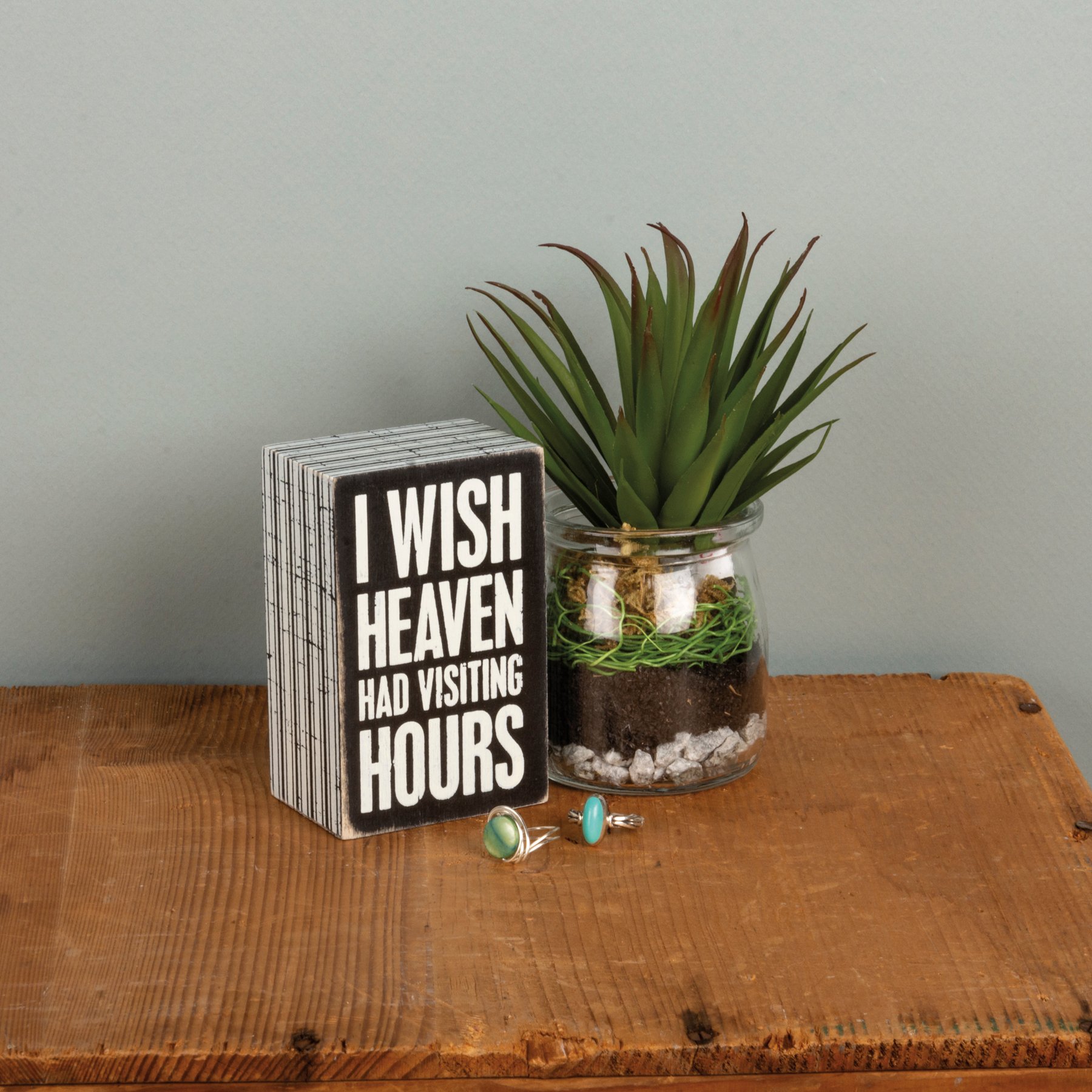 A classic black and white wooden box sign featuring a distressed "I Wish Heaven Had Visiting Hours" sentiment with striped trim designs. Easy to hang or can free-stand alone.