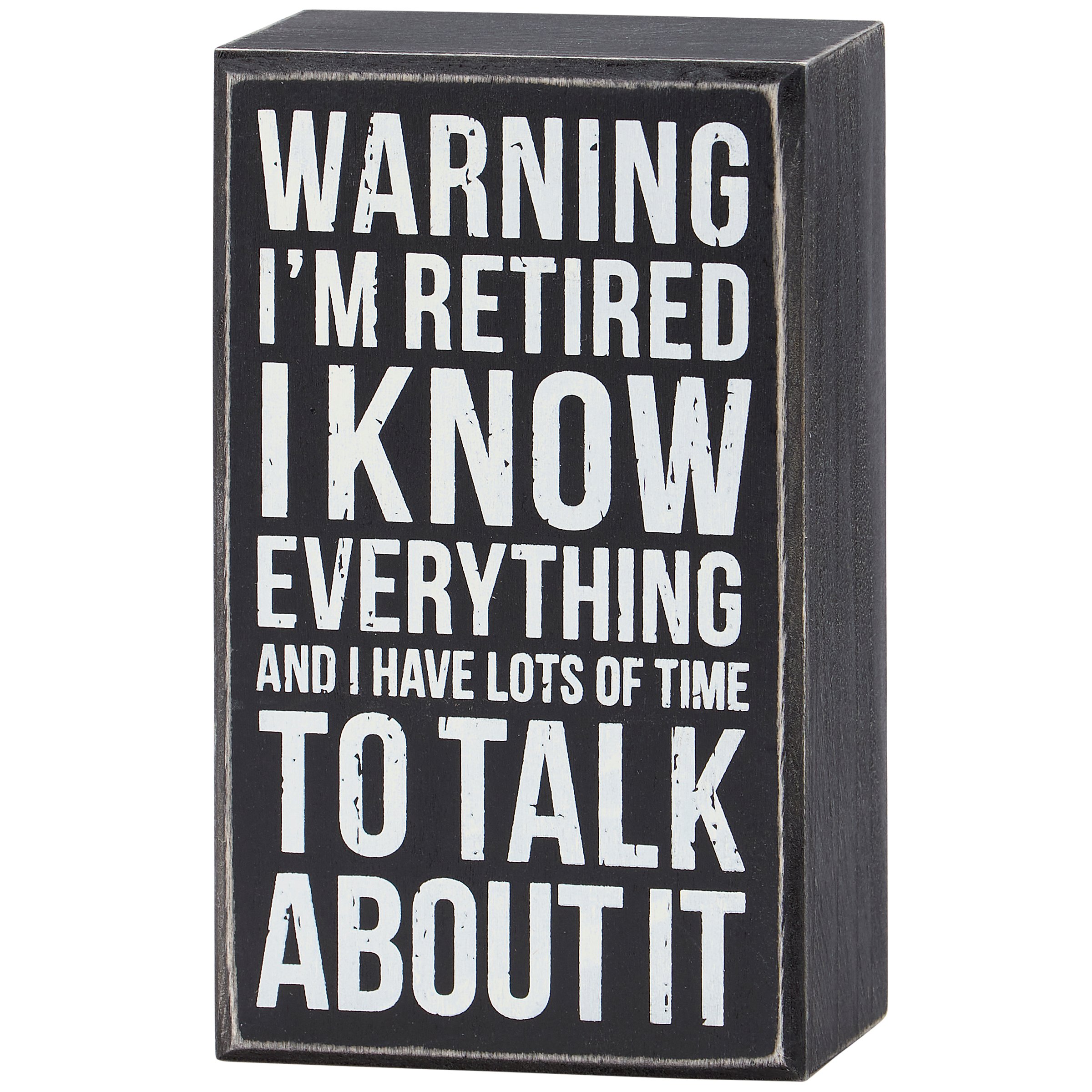 A classic black and white wooden box sign from our Retirement Collection displaying a humorous retirement inspired sentiment that reads "Warning - I'm Retired - I Know Everything And I Have Lots Of Time To Talk About It." Funny box sign features distressed details with coordinating black color on sides and back. Our Warning I'm Retired box sign is easy to hang or can free-stand alone. A funny retirement gift that can be easily displayed in any home or recreational space.