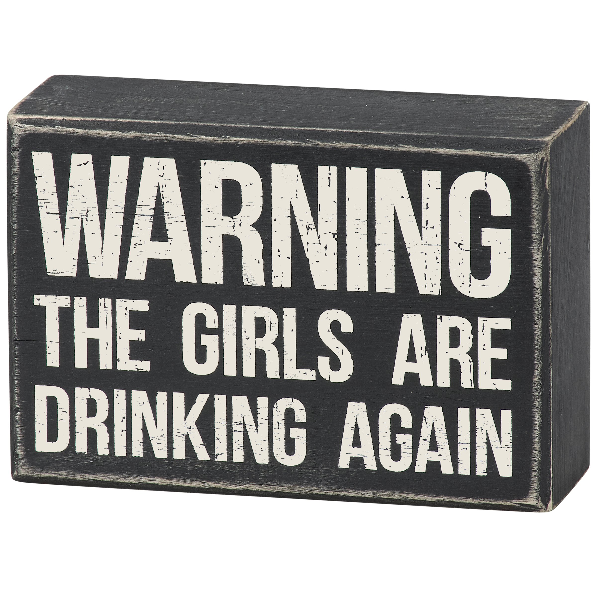 A classic black and white wooden box sign from our Box Sign Style Collection displaying a funny alcohol inspired sentiment that reads "Warning - The Girls Are Drinking Again." This funny alcohol box sign features distressed details with a coordinating black color on sides and back. Our The Girls Are Drinking Again sign is easy to hang or can free-stand on a flat surface for display. A fun alcohol themed home accent that can be easily displayed to add personality to any home or work space.