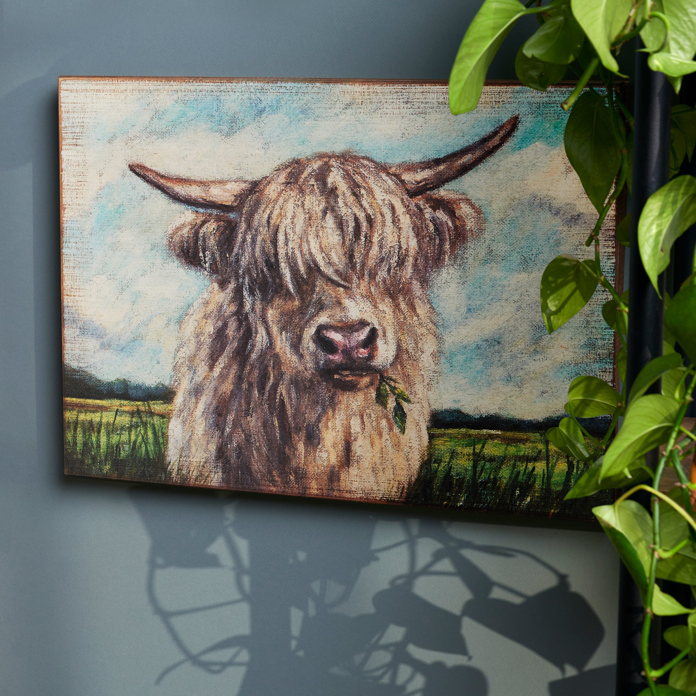 A wooden box sign from our Farmhouse Collection displaying a comforting hand painted design of a white highland cow in a field. Design is replicated from original artwork painted onto burlap canvas, giving the art a unique depth and texture. Box sign features distressed details with coordinating natural wood sides and back. Our White Highland sign is easy to hang or can free-stand alone. A rustic everyday home accent that can be easily displayed in any home or work space.
