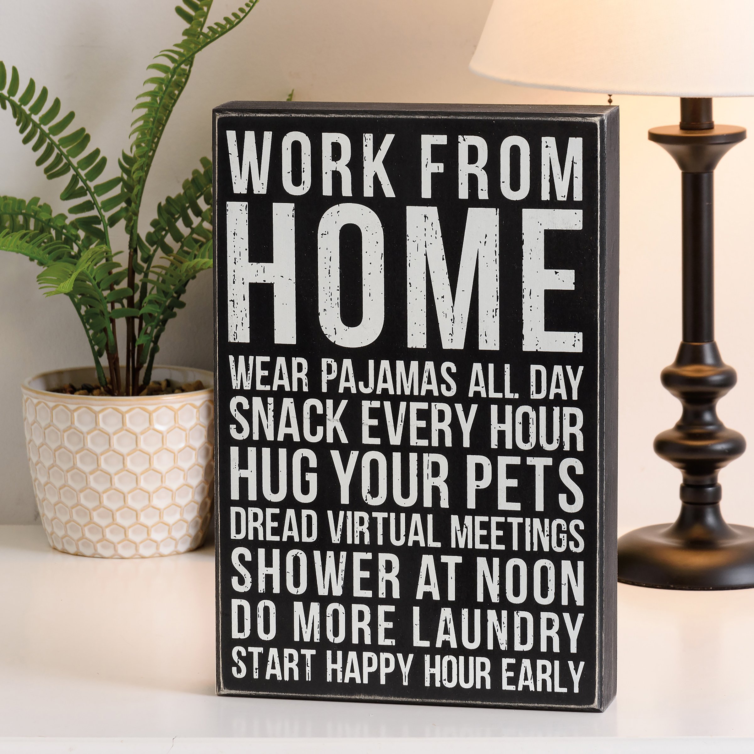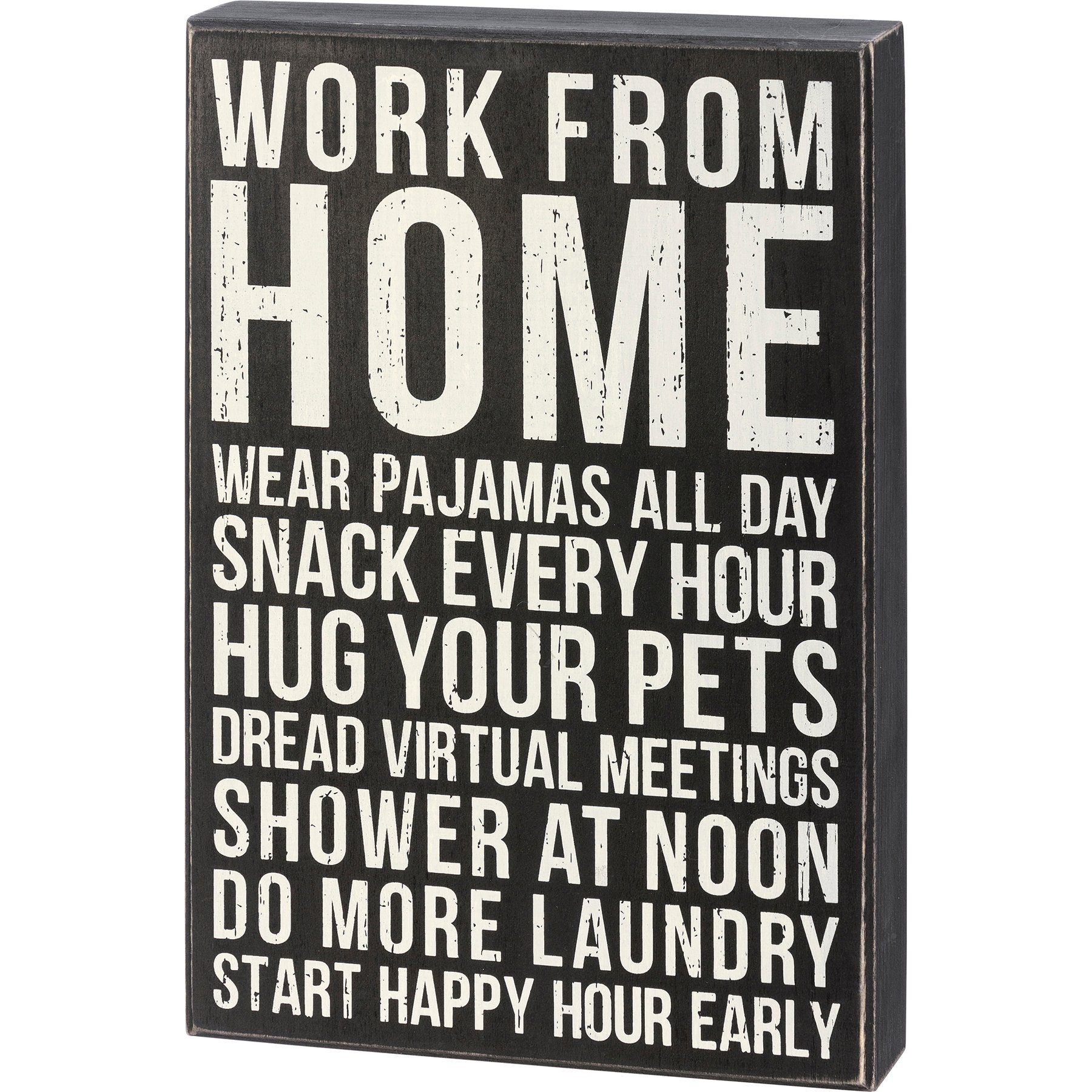 A classic black and white wooden box sign featuring a distressed "Work From Home Wear Pajamas All Day Snack Every Hour Hug Your Pets Dread Virtual Meetings Shower At Noon Do More Laundry Start Happy Hour Early" sentiment. Our Work From Home box sign is easy to hang or can free-stand alone.