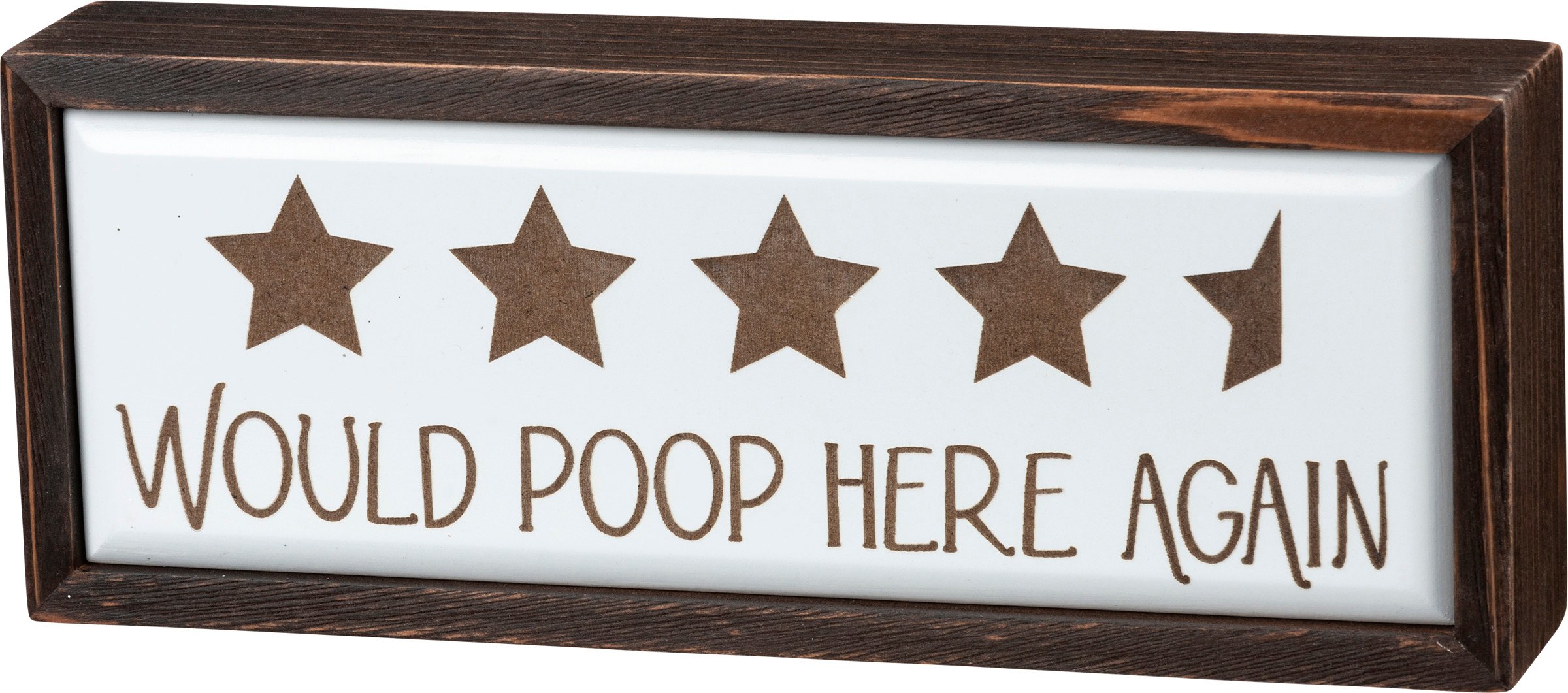A wooden box sign featuring a "Would Poop Here Again" sentiment with design of four and a half stars. Features a tile-like finish. Easy to hang or can free-stand alone. Complements well with other pieces in collection.