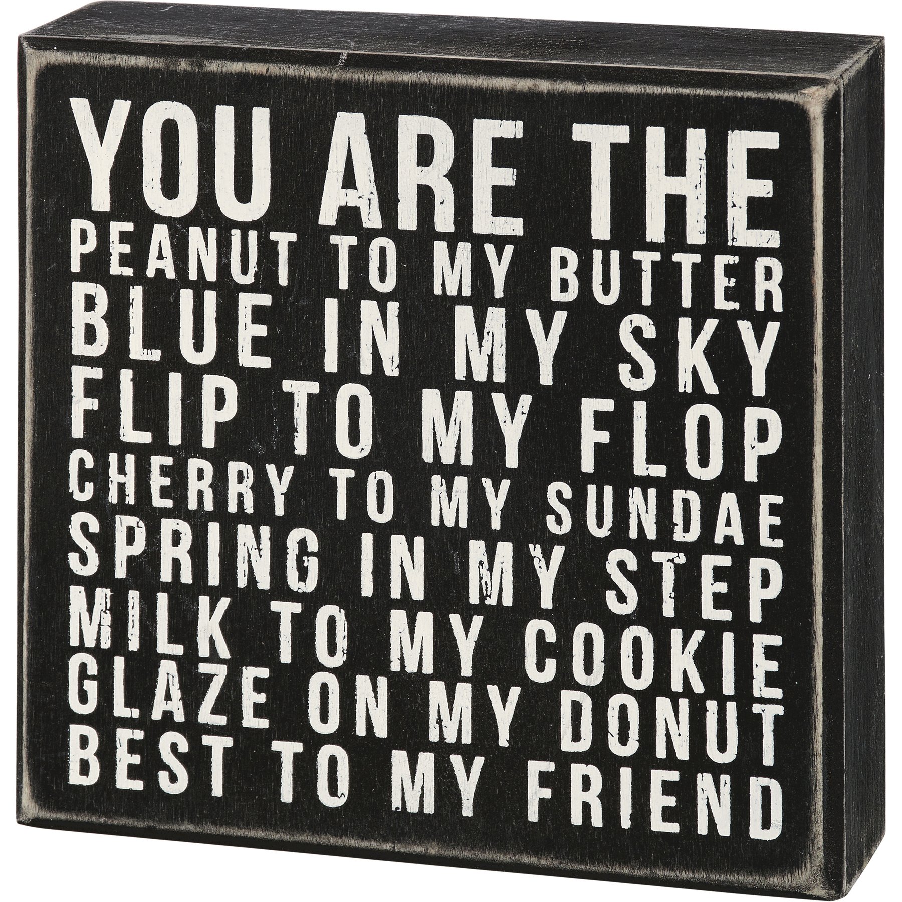 A classic black and white wooden box sign featuring a distressed "You Are The Peanut To My Butter - Blue In My Sky - Flip To My Flop - Cherry To My Sundae - Spring In My Step - Milk To My Cookie - Glaze To My Donut - Best To My Friend" sentiment. Easy to hang or can free-stand alone.