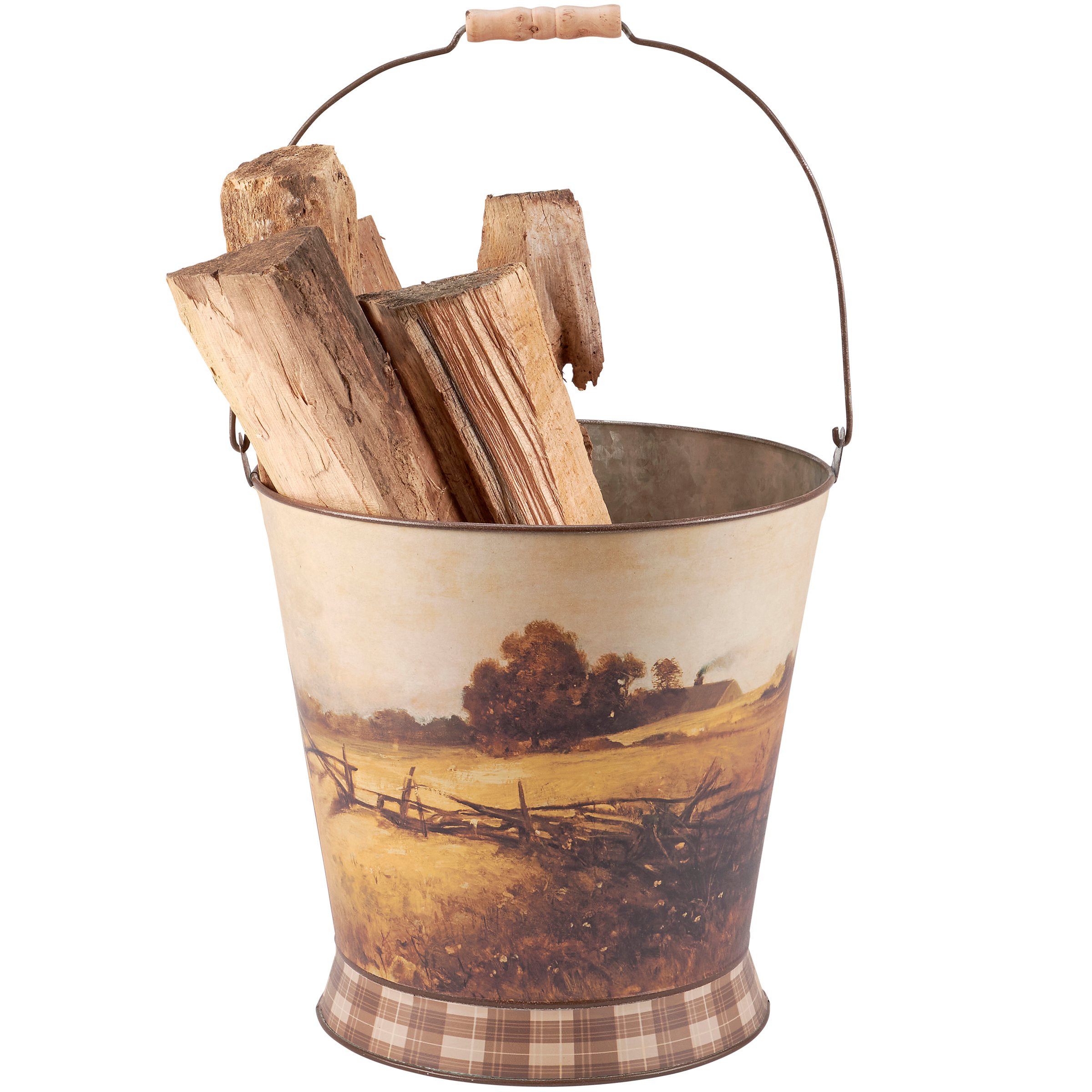 A galvanized metal bucket from our Fall & Harvest Collection displaying a full wrap-around design of a rural farmland scene inspired by Old World home décor. Base of bucket also displays a complementing fall inspired plaid. Bucket is perfect for displaying seasonal décor or storing household items in style. Accessories pictured not included. Our Rural Farmland bucket includes a metal handle with wooden grip for easy carrying. A rustic home accent with a variety of display options.