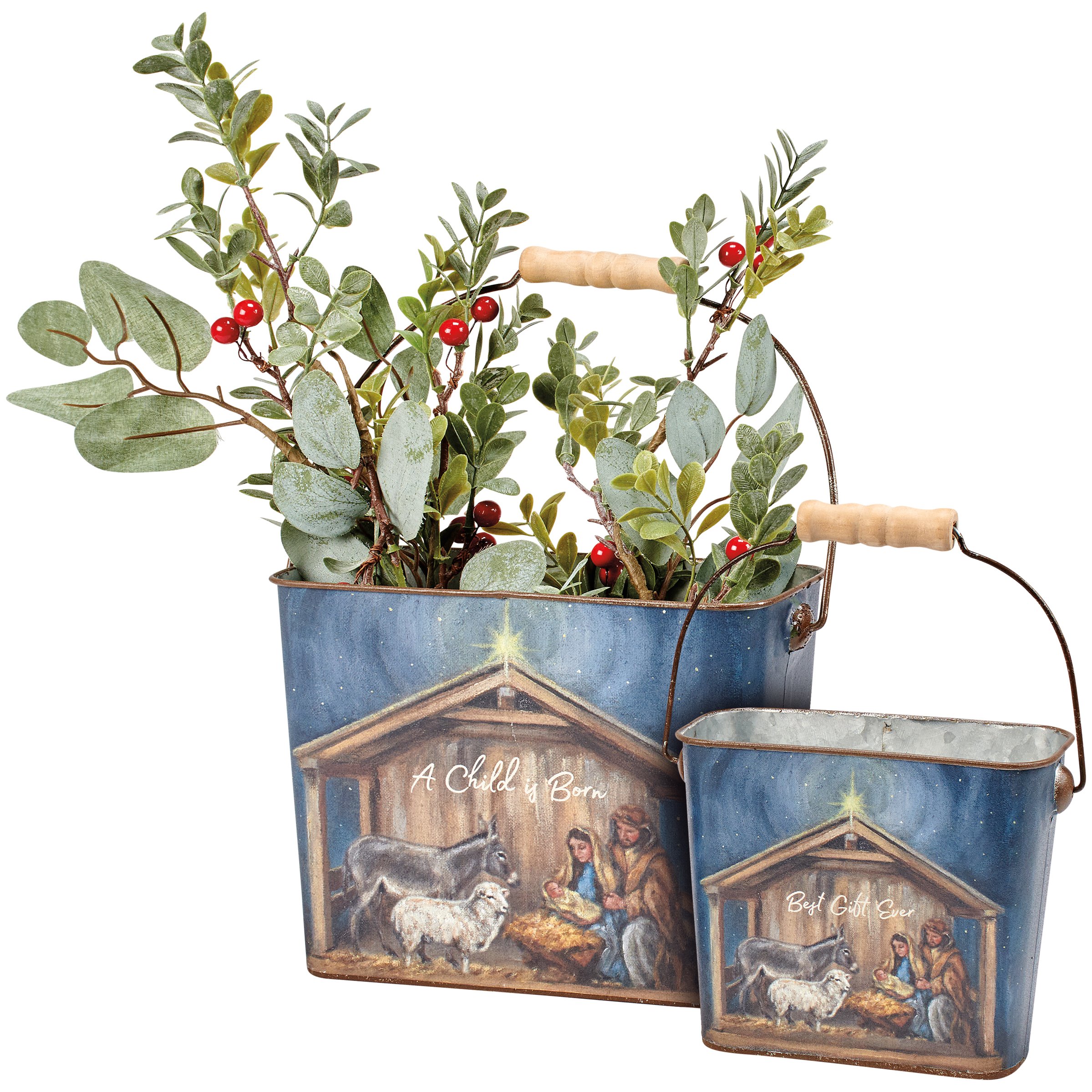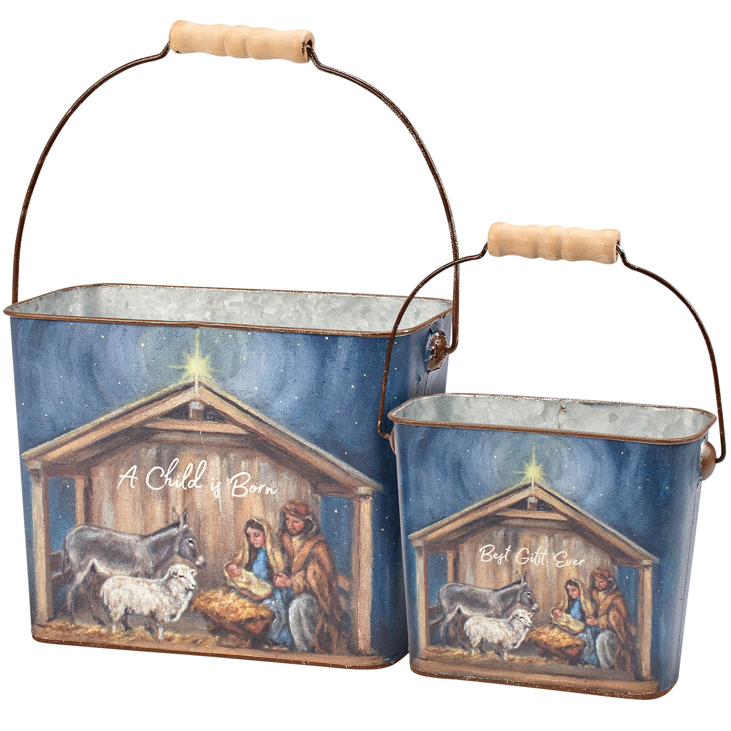A set of 2 metal buckets from our Christmas Collection displaying coordinating double-sided designs. Each seasonal bucket features a hand painted nativity scene with "A Child Is Born" sentiment on the larger bucket and "Best Gift Ever" sentiment on the smaller bucket. Nativity designs are replicated from original artwork painted onto burlap canvas, giving the art a unique depth and texture. Seasonal bucket set is perfect for holding small household objects or holiday greenery. Greenery pictured not included. Our A Child Is Born bucket set includes metal handles with a wooden handle at the top for easy carrying and stack inside each other for compact storage. A set of seasonal home accents with a variety of display options.