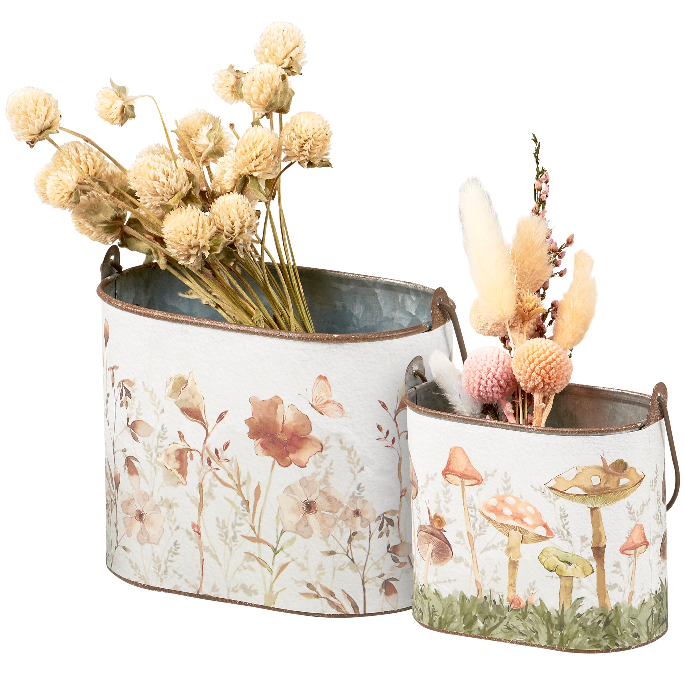 A set of two metal bins in varying sizes from our Cottagecore Collection displaying individual nature-themed designs on each. Bins feature hand painted designs including standing flowers on larger bin and mushrooms on the smaller bin. Our Bin set is perfect for holding small household objects or greenery. Greenery pictured not included. Our Cottage Garden bin set includes metal handles with metal loop at the top for hanging and nest inside each other for easy storage. A rustic set of everyday home accents with a variety of display options.