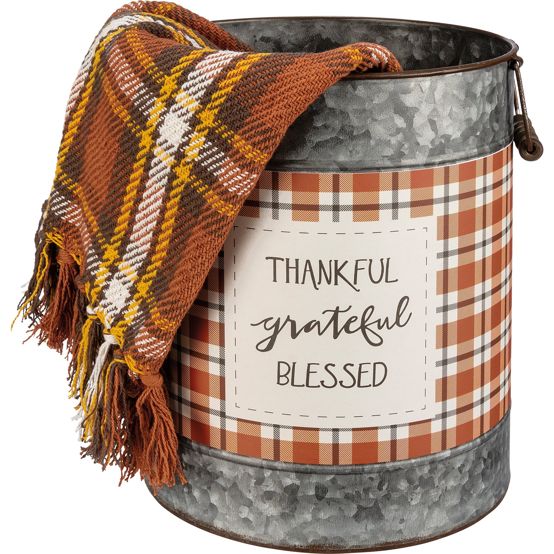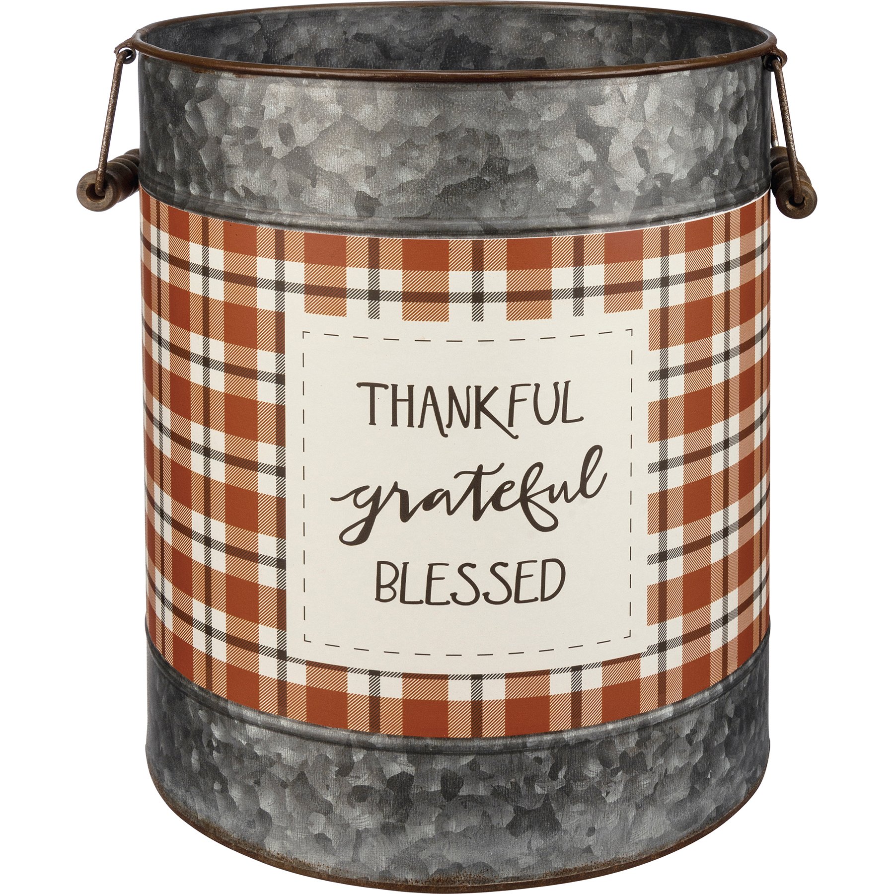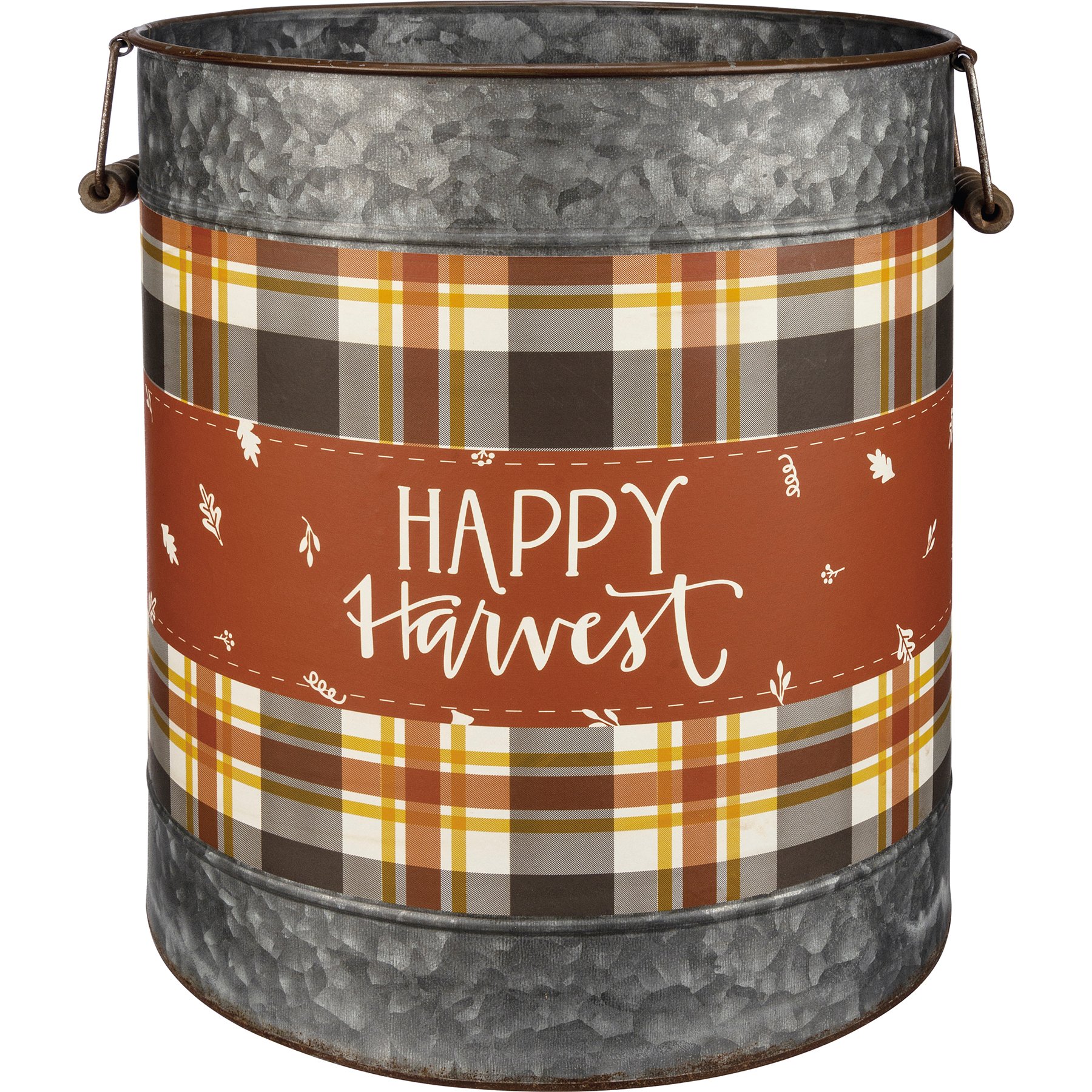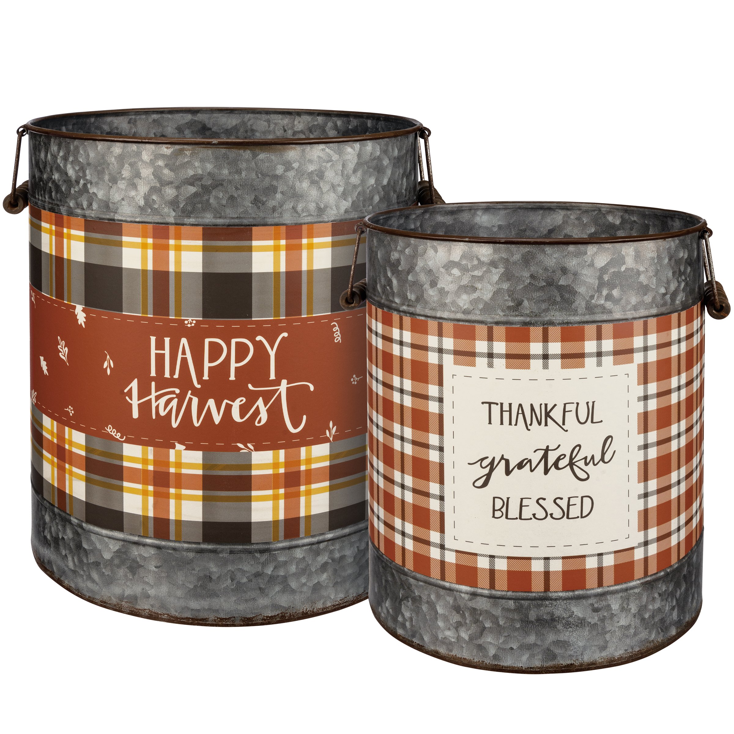 A set of two galvanized metal buckets with metal handles and wooden grips. Buckets have design bands with autumnal plaid patterns. Large bucket features "Happy Harvest" sentiment and small bucket features "Thankful Grateful Blessed" sentiment.