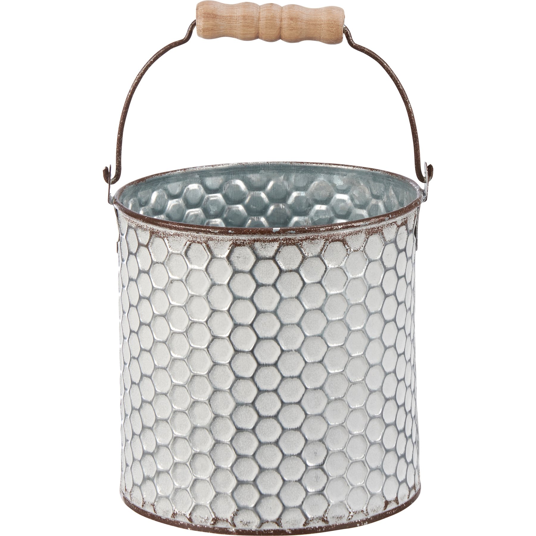 A set of two metal buckets in varying size from our Bee Collection displaying wrap-around debossed honeycomb designs on each. Bucket designs feature galvanized metal with wash of white paint for added texture. Perfect for storing gardening tools, greenery, or other small objects. Our Honeycomb bucket set includes metal handles with wooden grip for easy carrying. Accessories not included.