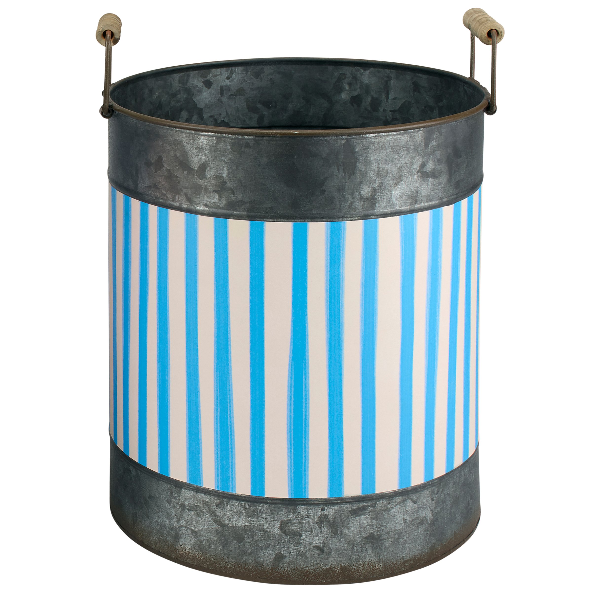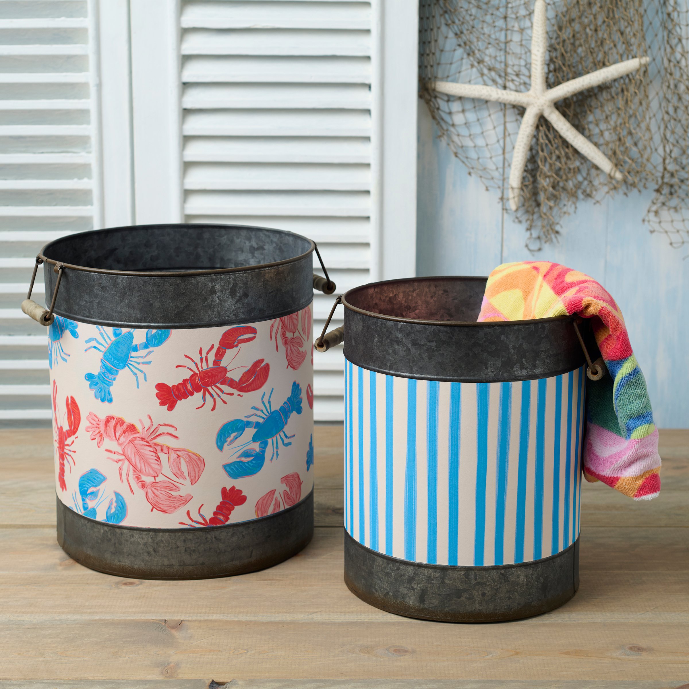 A set of 2 metal buckets in different sizes from our Beach Collection featuring individual full wrap-around designs inspired by Italian coastal style. Beach bucket designs include a pattern of lobsters on the larger bucket and a coordinating stripe pattern on the smaller bucket. Italian coastal designs are replicated from original art hand painted in a unique watercolor style. Accessories pictured not included. Our Lobsters bucket set includes metal handles with wooden grips for easy carrying and they nest inside each other for compact storage. A set of beach themed home accents with a variety of display options.