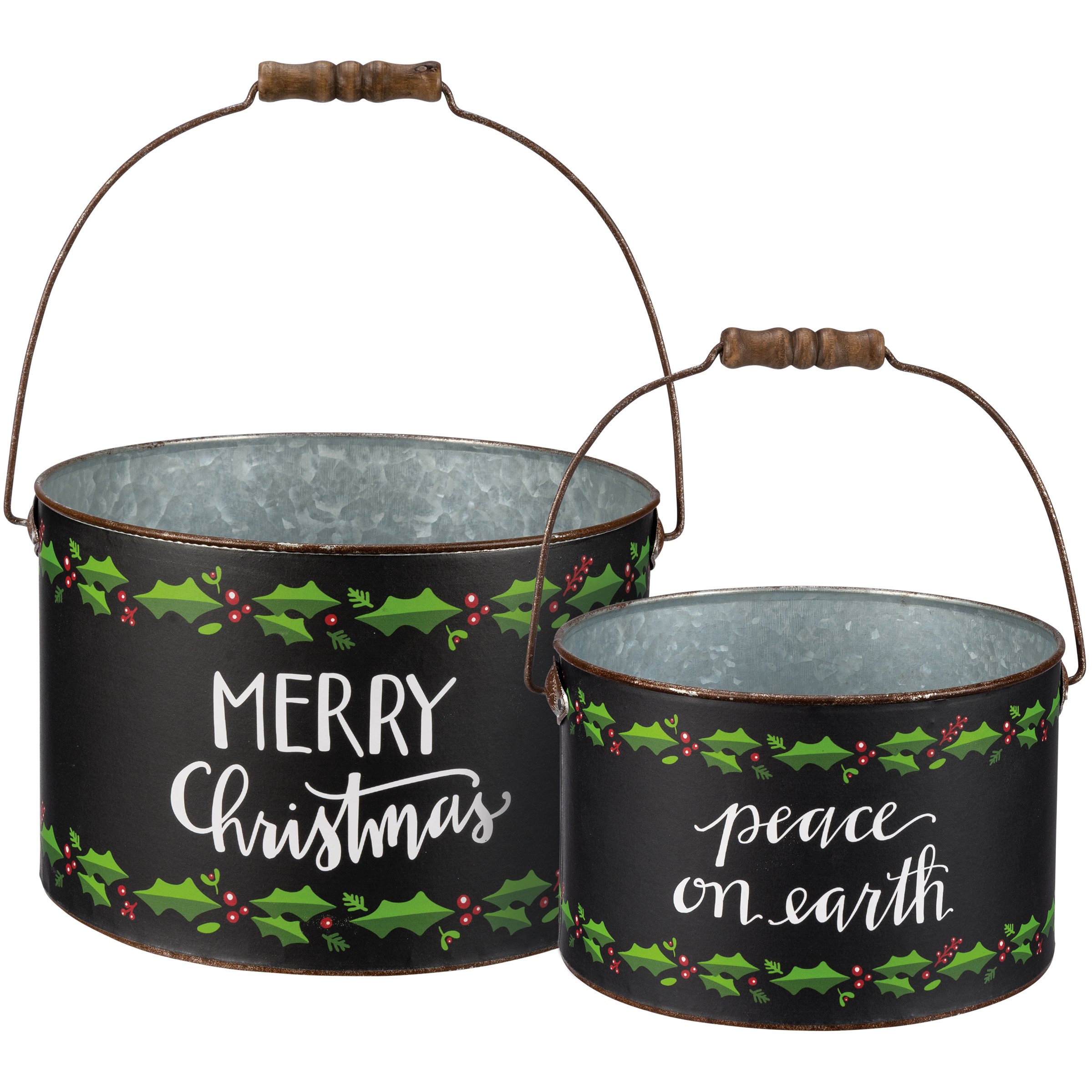 A set of two galvanized metal buckets with metal handles and wooden grips. Buckets have design bands featuring a moody palette with holly leaf patterns and hand lettered sentiments . Large bucket features "Merry Christmas" sentiment and small bucket features "Peace On Earth" sentiment.