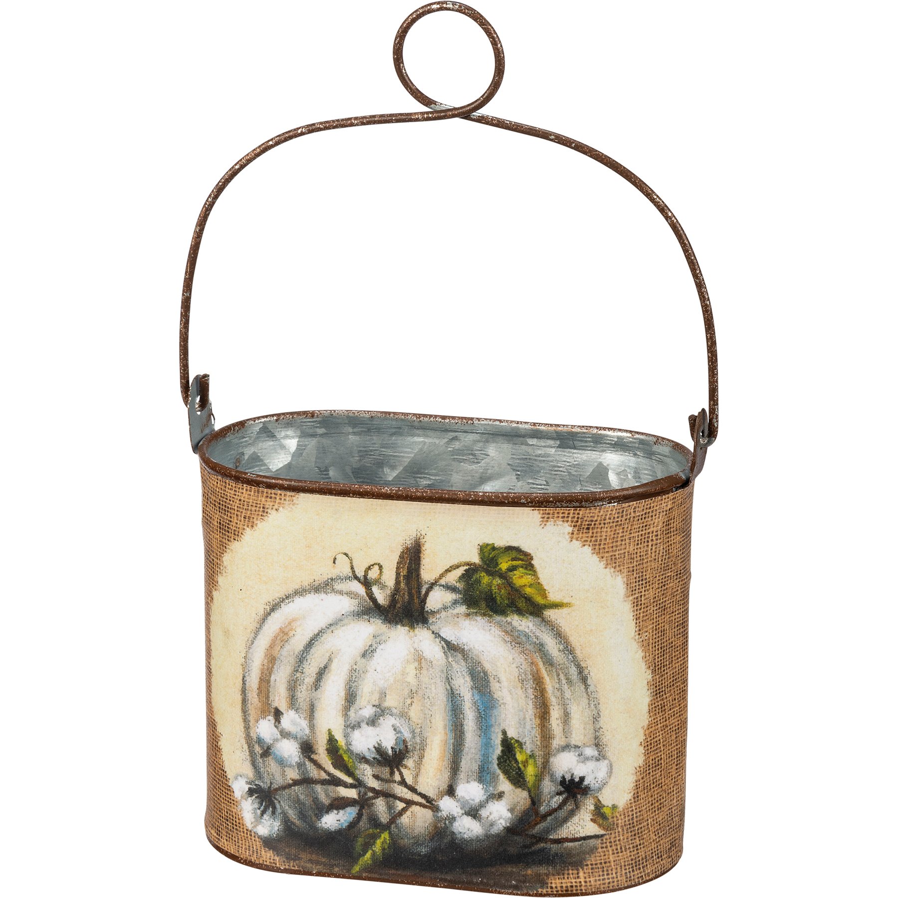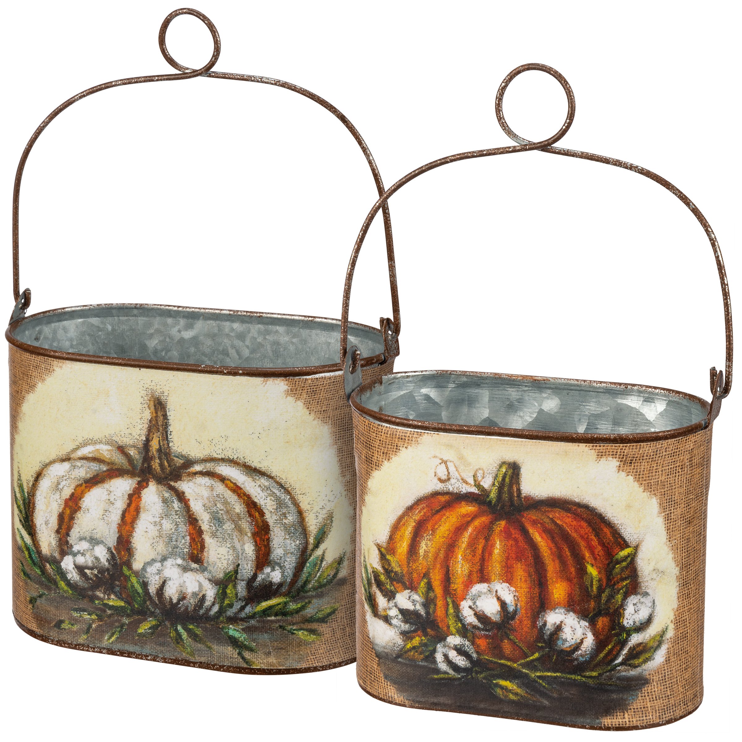 A set of two double-sided, rounded metal bins featuring multicolored pumpkin designs. designs are replicated from original artwork painted onto burlap canvas, giving the art a unique depth and texture. Contains metal handles for easy carrying.