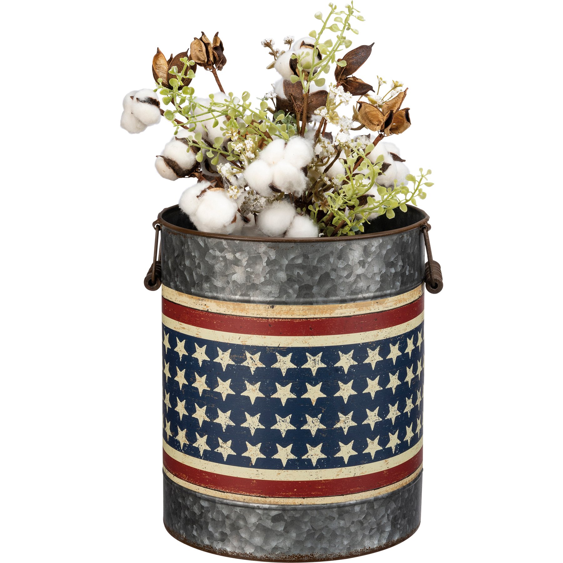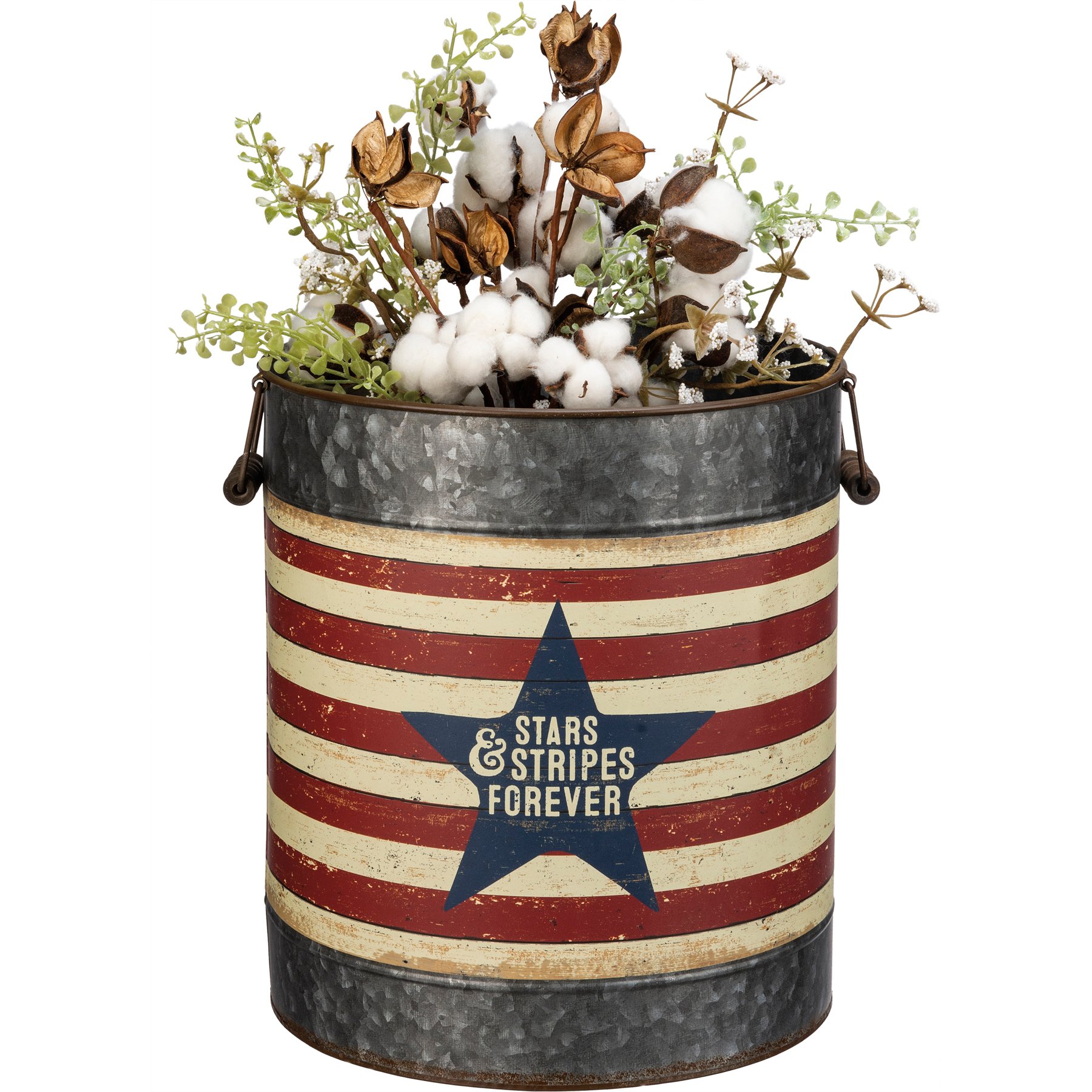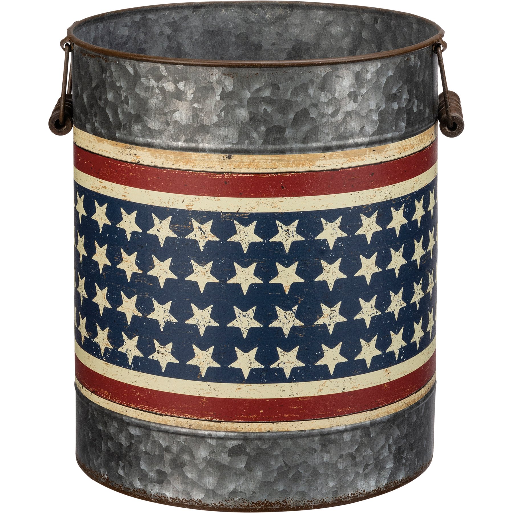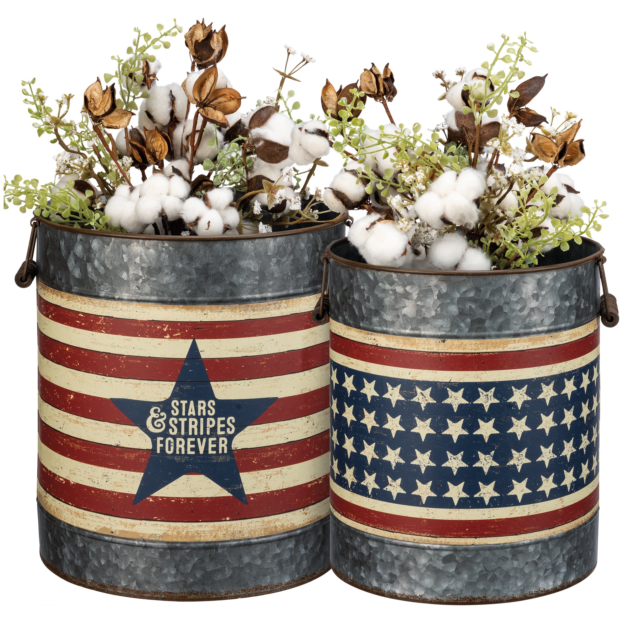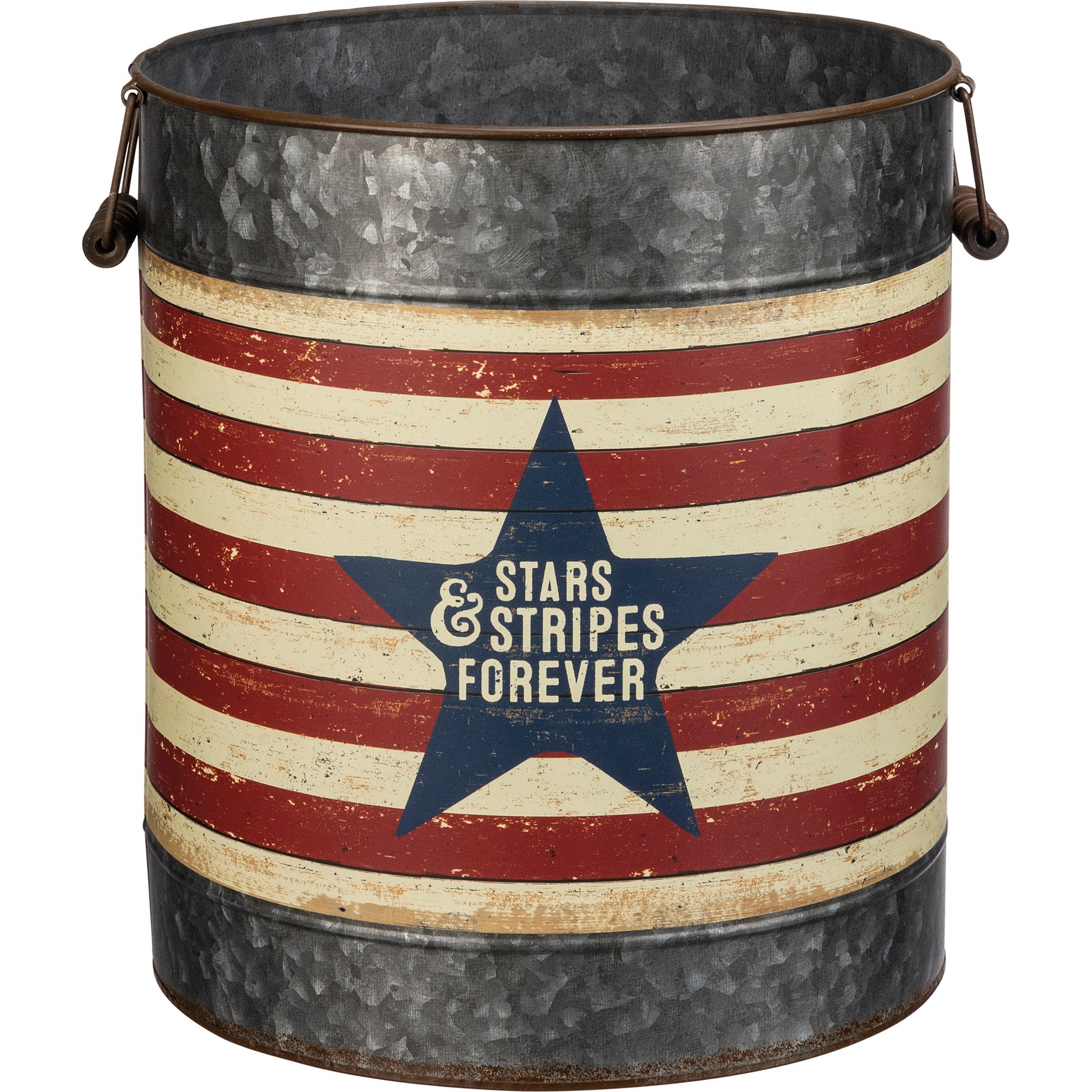 A set of two galvanized metal bins from our Patriotic Collection each featuring dual adjustable handles and wooden grips for easy carrying. Large bucket features all-over stripe design with star icon and "Stars & Stripes Forever" sentiment. Small bucket features all-over stars and stripes pattern. Our Stars & Stripes Forever Buckets are double-sided and feature a patriotic palette.