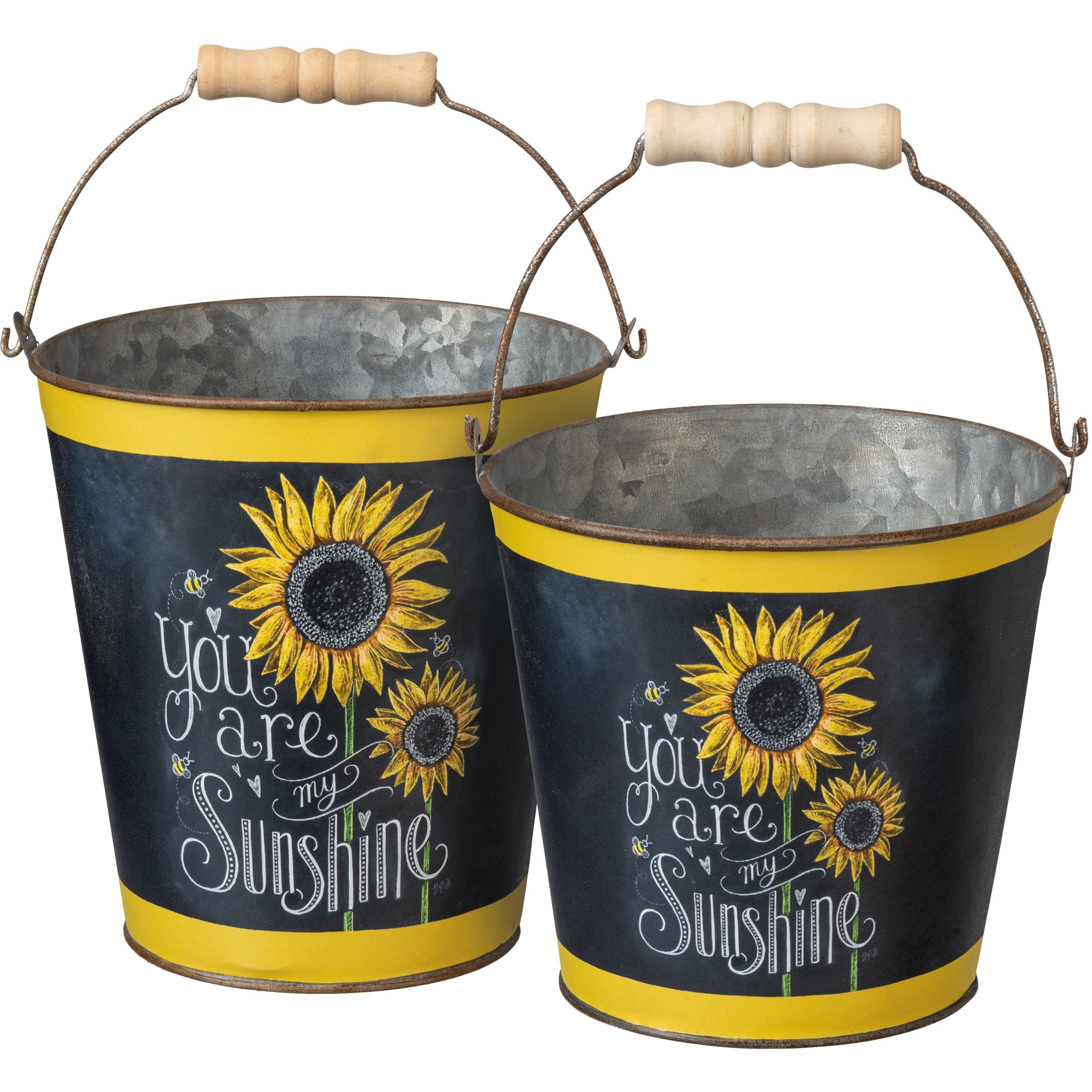 A set of two tin buckets with double-sided chalk art sunflower designs and "You Are My Sunshine" sentiment. Set complements well with other pieces in collection to create a cohesive display.